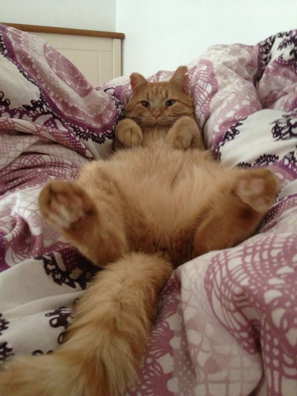 "When I come home from work he is waiting by the door and kind of puts his front paws up on my legs and purrs. So I pick him up and he grabs me around the neck and just strokes his face against mine whilst purring for like 15 minutes. It's awesome."