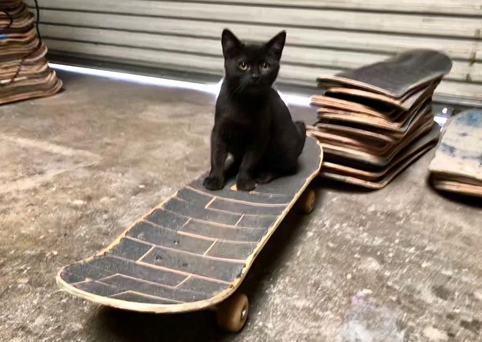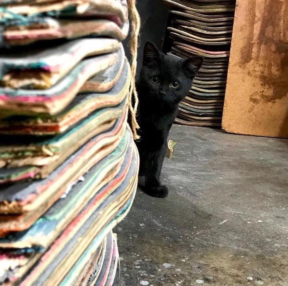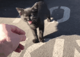Justin LaRose found a little black kitten wandering around a dumpster for food scraps. He called to him to see if the kitty would respond. Right away, the kitten jumped out and headed over to him.