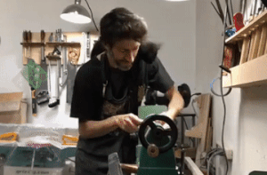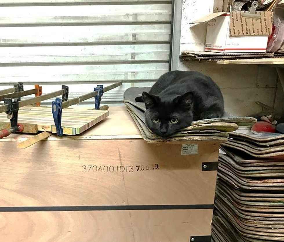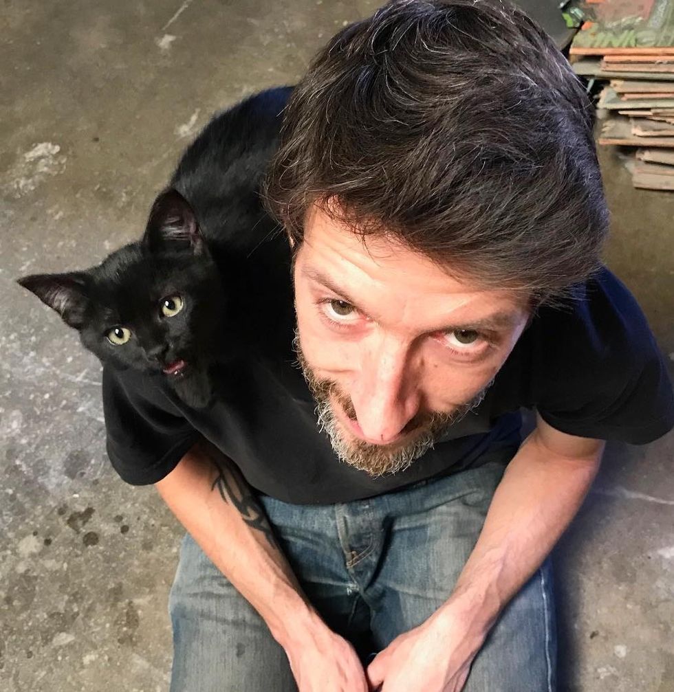 He couldn't leave the kitten out fending for himself, and when he brought him into his woodshop, the little guy started rubbing his face all over him.