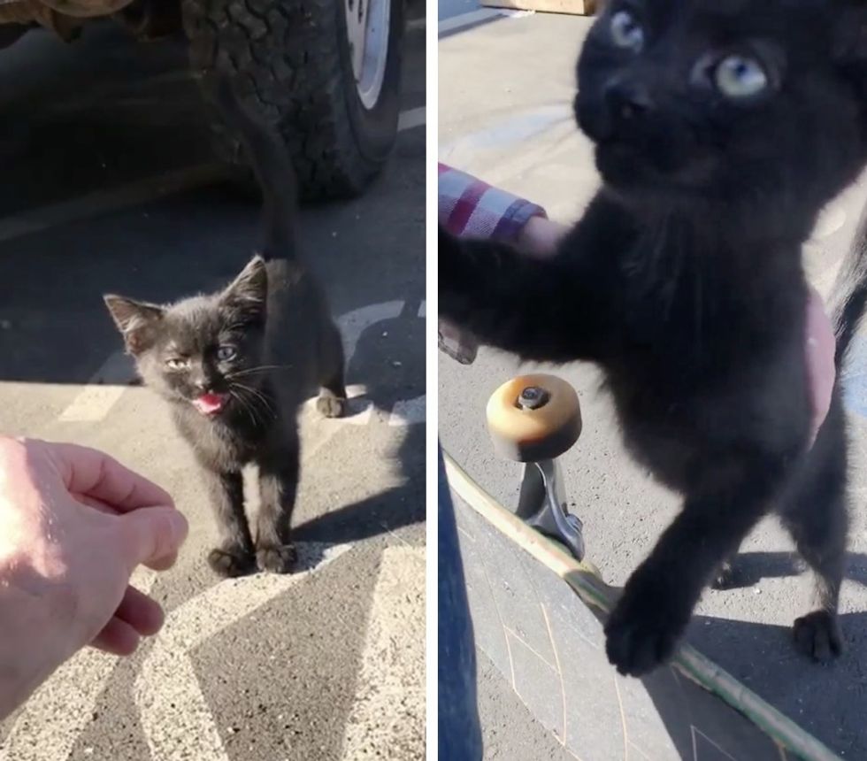 A man from Long Beach, California came across a homeless kitten who meowed for his attention.