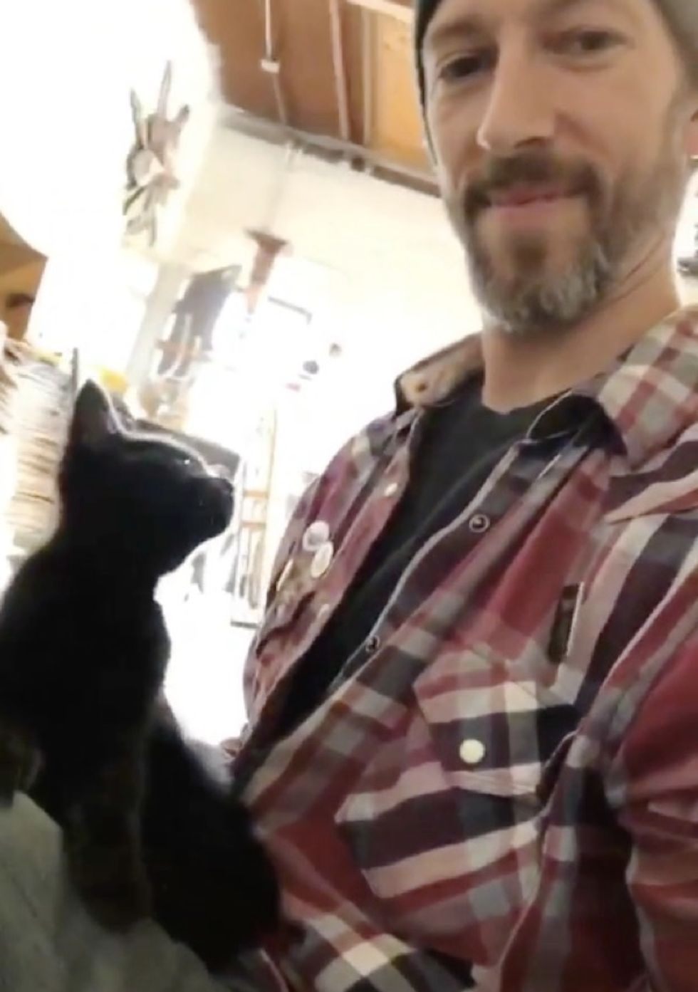 When he approached the kitty, the tiny feline walked right up to him for some snuggles.