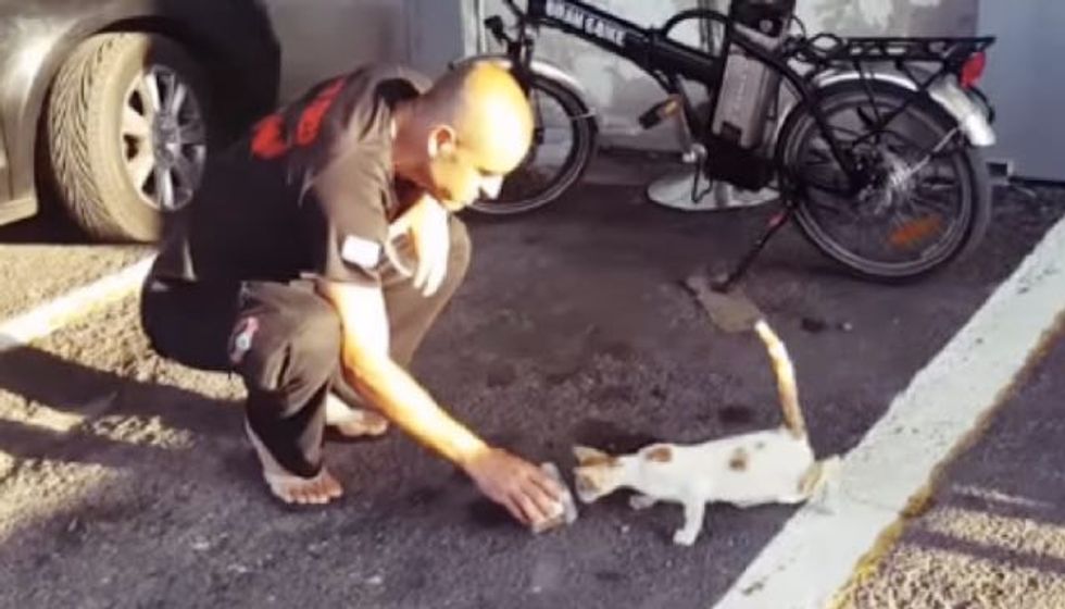 The next day, Cafri brought some food for their new kitty. She was still a bit skeptical about people, but slowly she started opening up to the firefighters.