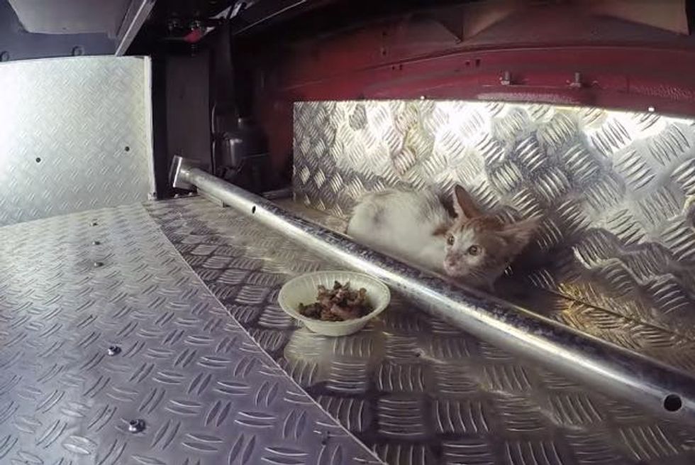 This little homeless kitten has found trust and love in these firefighters who rescued her from a car engine and gave her a forever home at their fire rescue station.