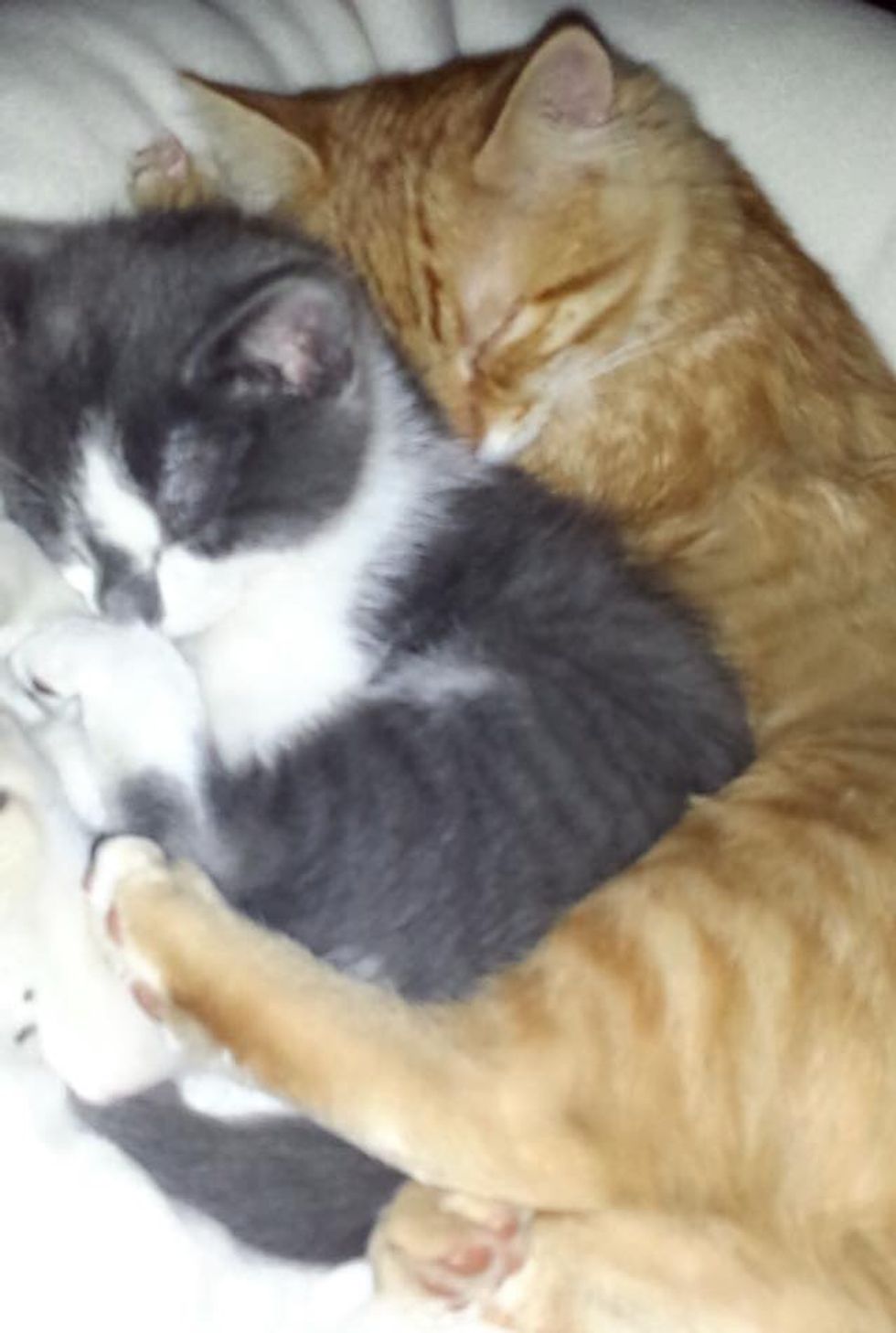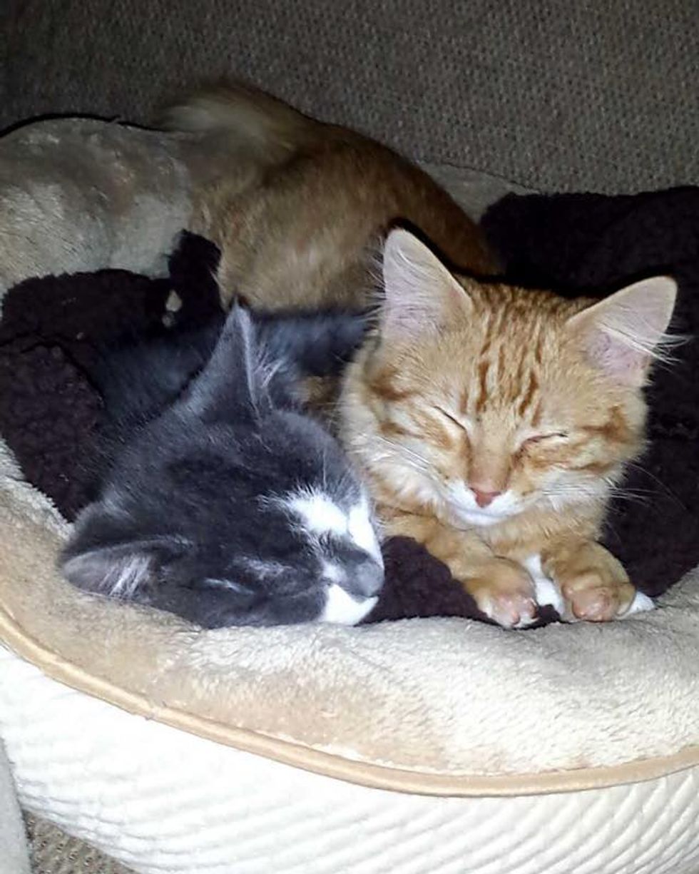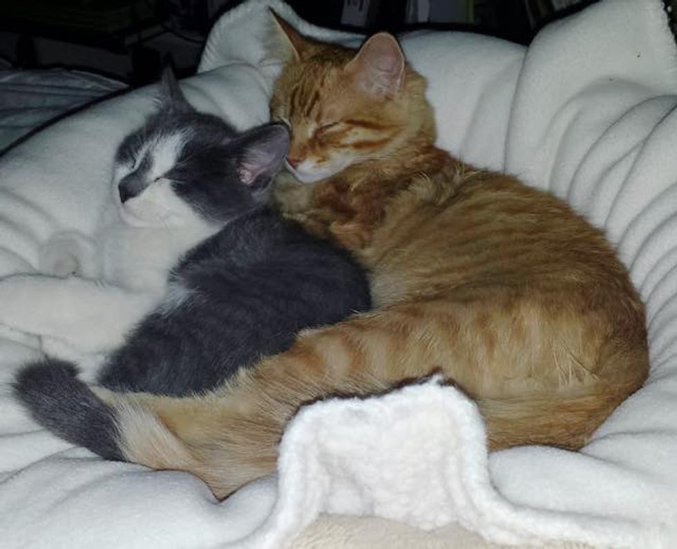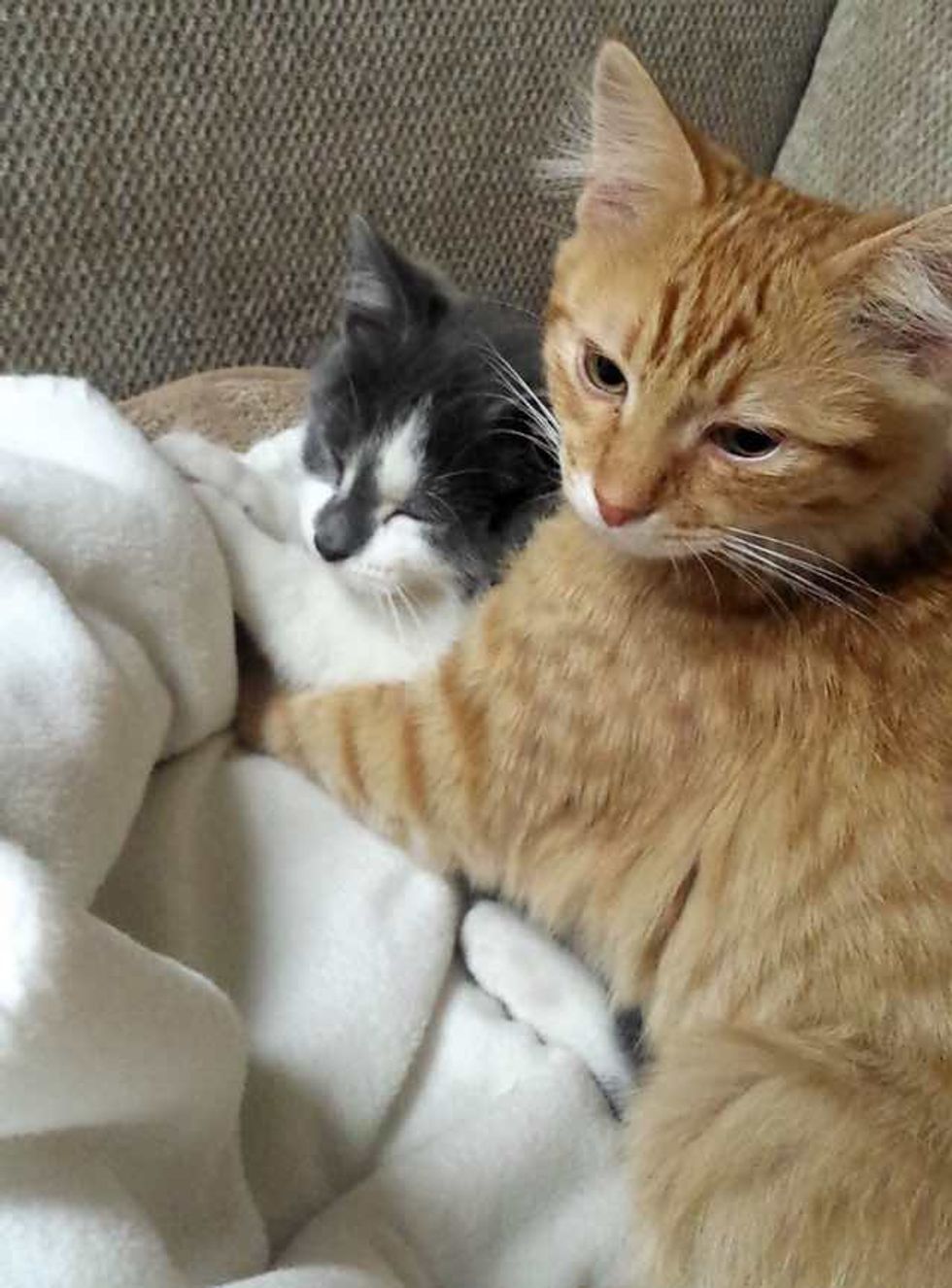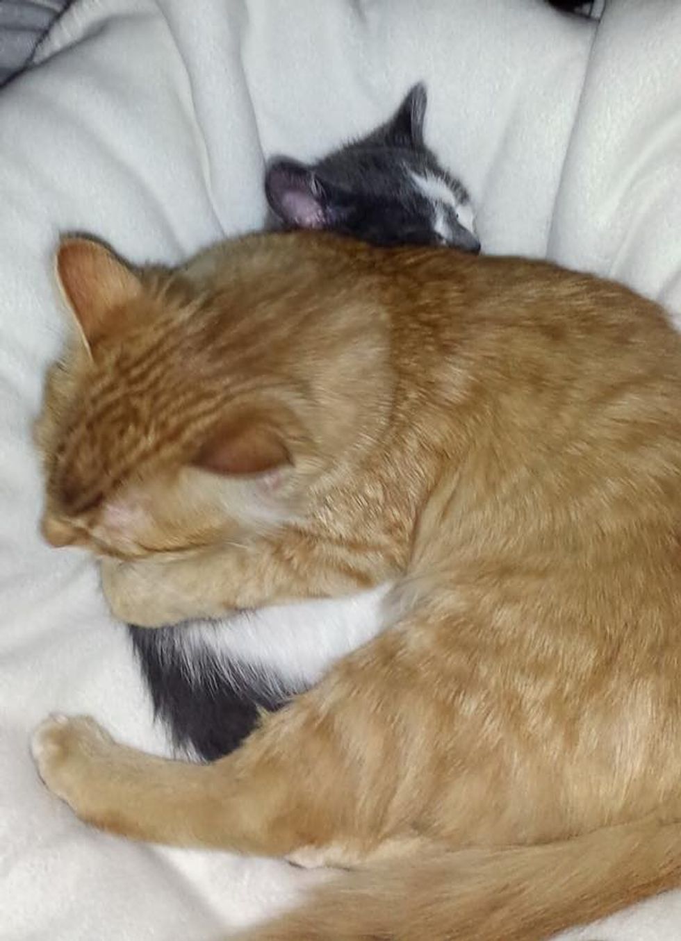 Photo via redditMilo the ginger cat met a friendly stray one day and the little gray kitten became very attached to him and followed him into his home. "(Milo's) been helping me nurse it since," reddit user OmgItsDaMexi said.