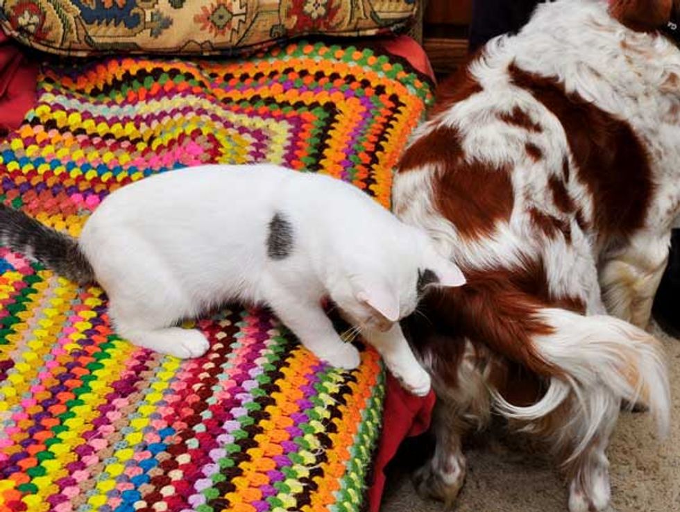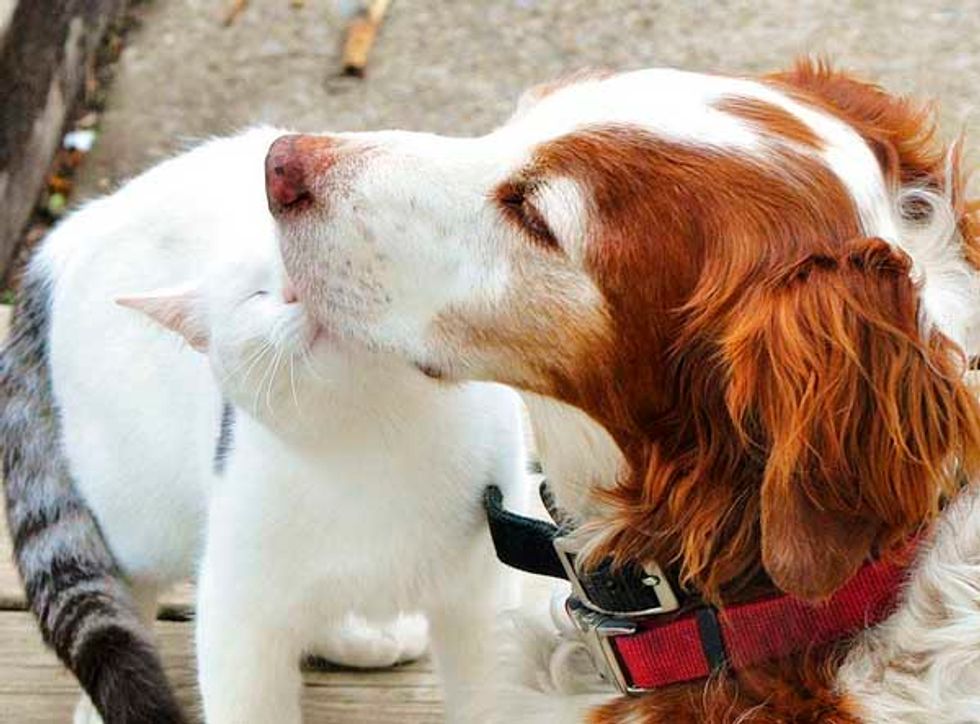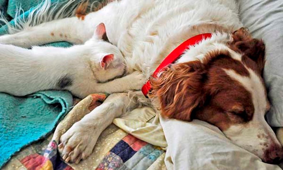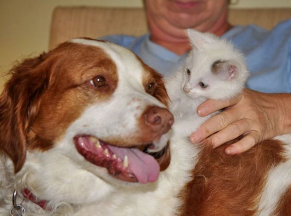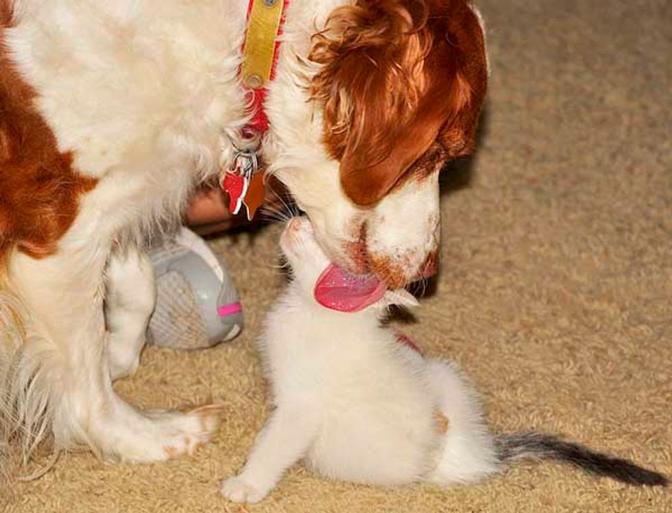 Homer the little kitty was rescued and brought into his new home with a cast on his leg. While the other cat was hesitating about the new comer, Annie the dog swooped in and welcomed him with a bath. The two have bonded ever since. Once Homer's cast was removed, he became a little terror in the house and Annie was there every step of the way like a protective mother watching her baby grow. These photos will give you the fuzzies :).