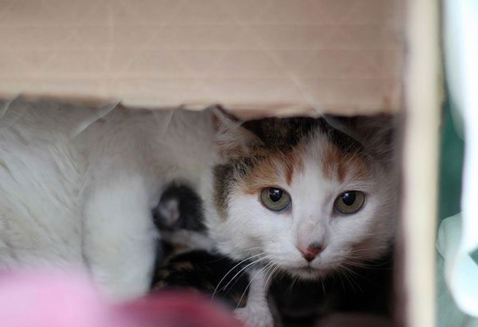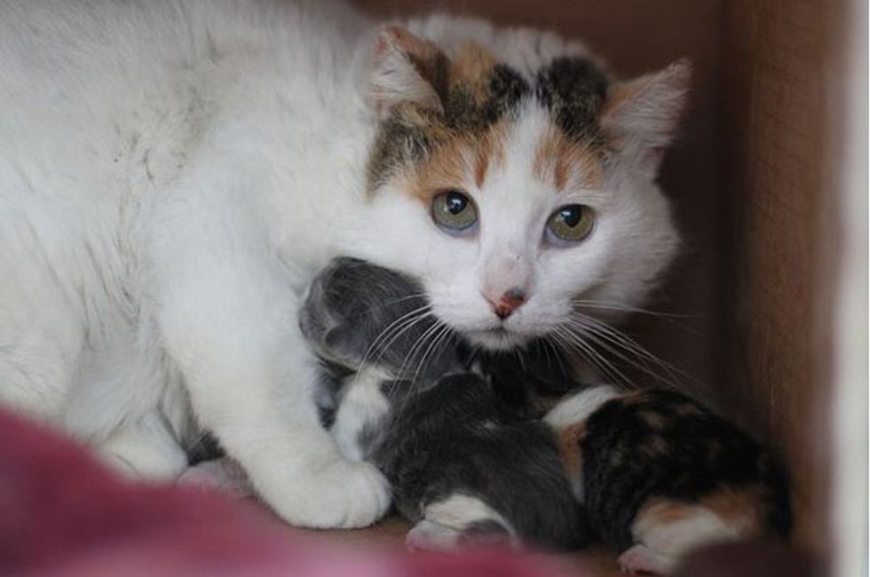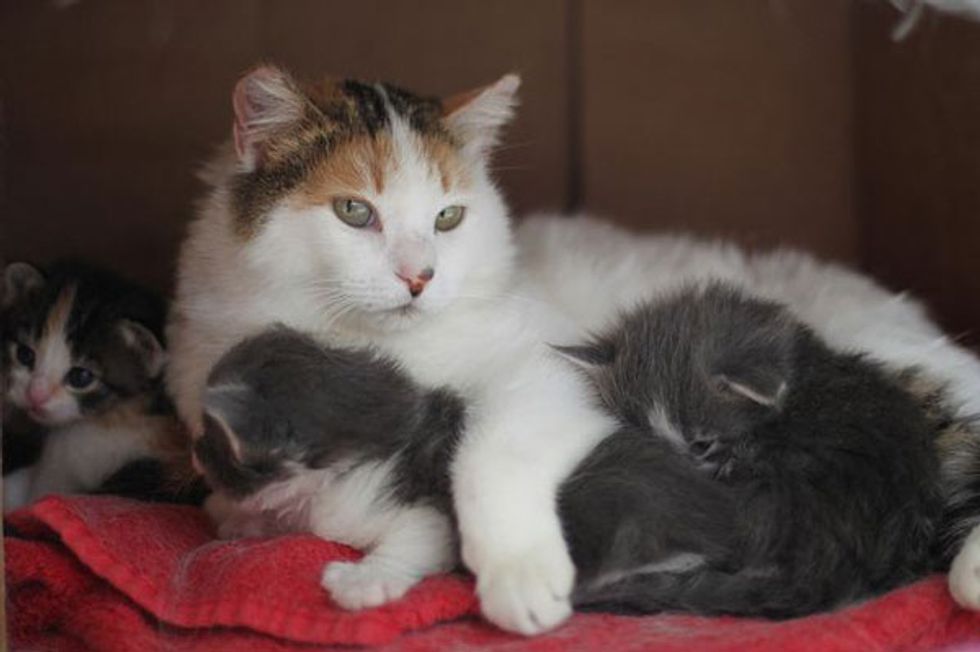Jean and her friends who run a TNR program spotted a very feral cat with a big belly. They knew the beautiful cat (they named Heidi) was about to give birth. Since Heidi was very feral and had no trust in humans, they made a box for her to nestle in at the farm and let her nurse her babies there.