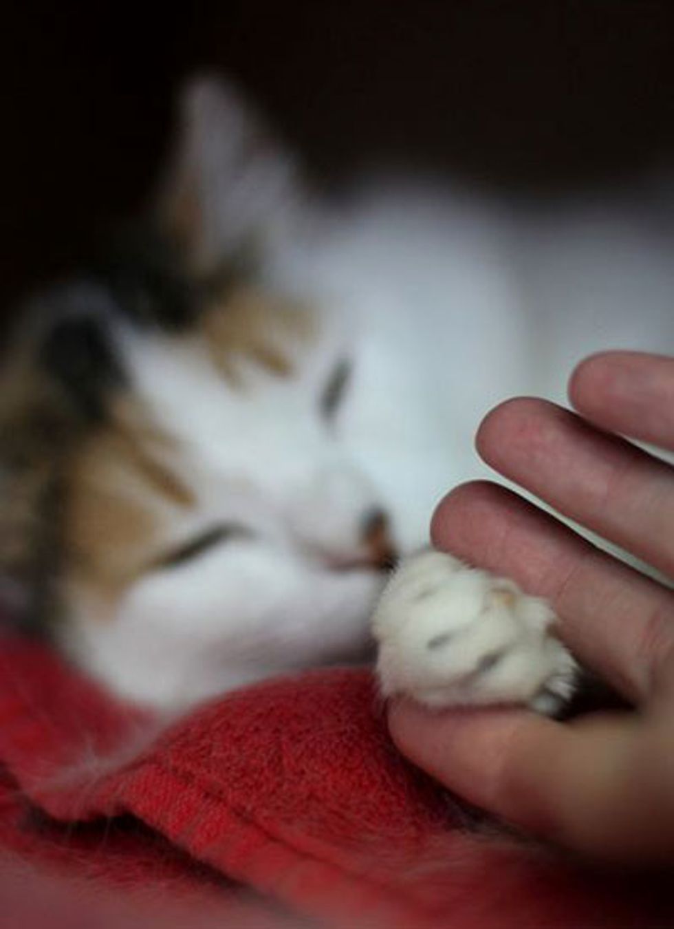 A few weeks after the babies were born, Heidi became more and more comfortable and relaxed around Jean. "I can reach in and touch her comfortably, even stroking her fur, but she apparently hisses at others. I hope she adapts to humans soon. Maybe when her kittens truely play with us." Jean could finally touch Heidi's toes while she was nursing.