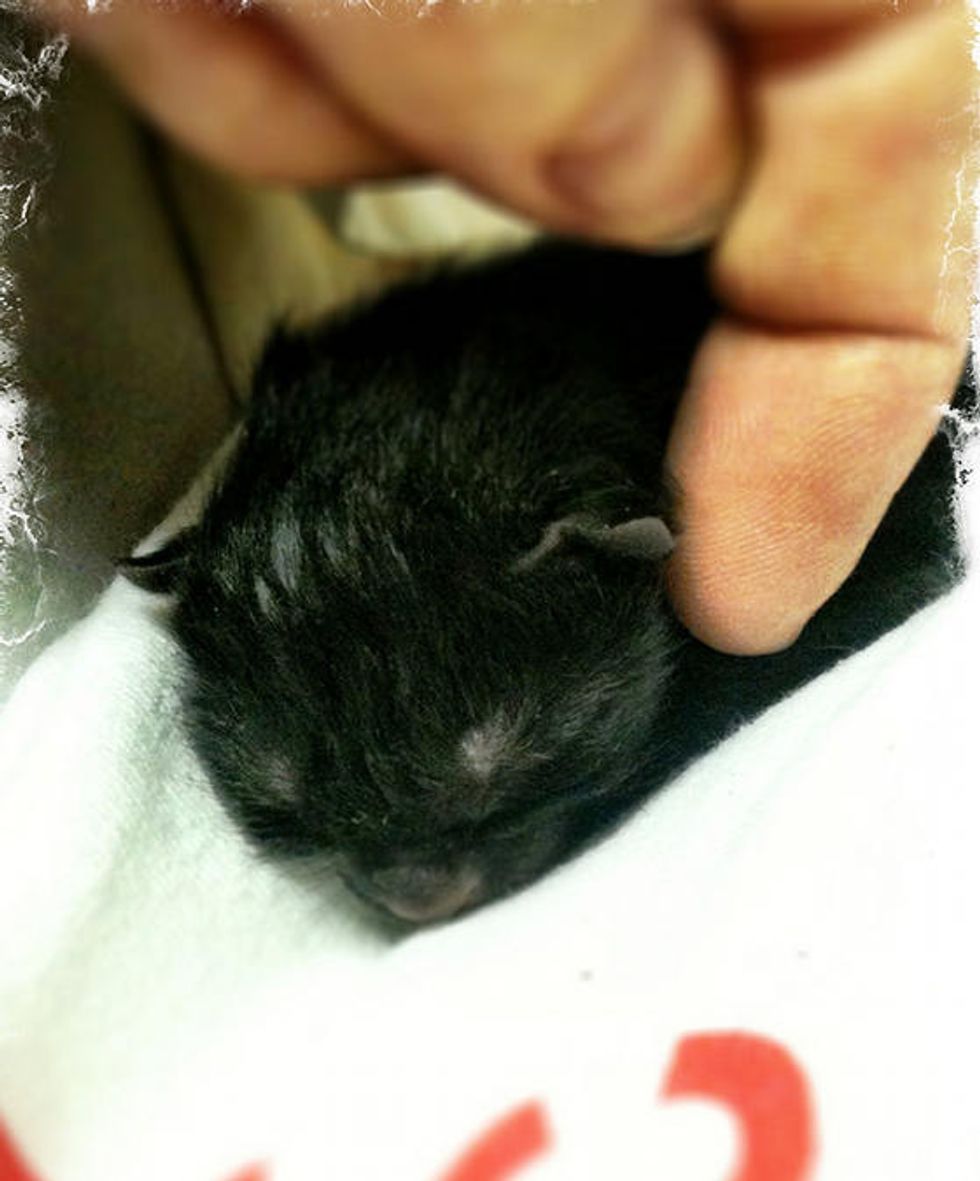 "He's just hours old. Except for some fly eggs in his left ear and general crustiness, he seems ok. At first feeding he only had a few drops of formula, but we'll try again every hour overnight and hope he latches on," said Lisa the foster mom.