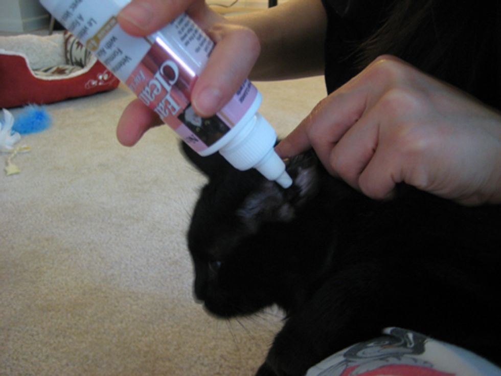 After you are done with cleaning, it is time to apply medicine into the ears. If your cat does not have ear mites, you can use the ear cleansing solution again for this step.