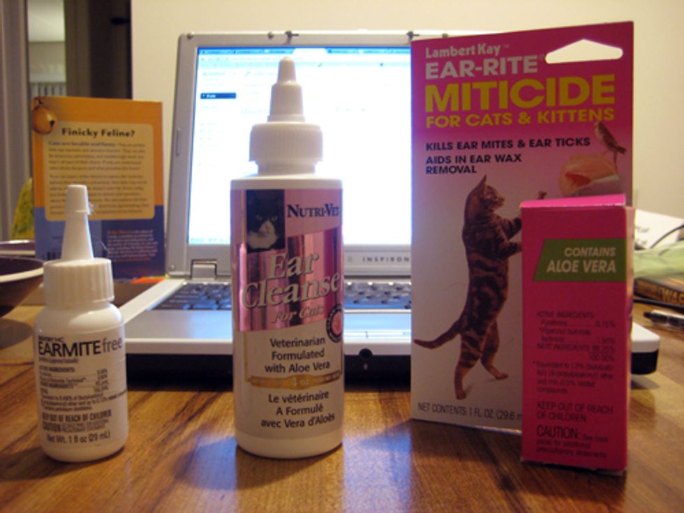 Jackie and Shadow, the 2 cats we adopted 2 weeks ago were infected with ear mites. Shadow's condition was not too bad at all, but Jackie was showing a lot of signs such as scratching and shaking his head. We had Jackie's ears treated at the vet, but the follow-up work became crucial in order to make sure the ear mites were thoroughly eradicated and would not reoccur.