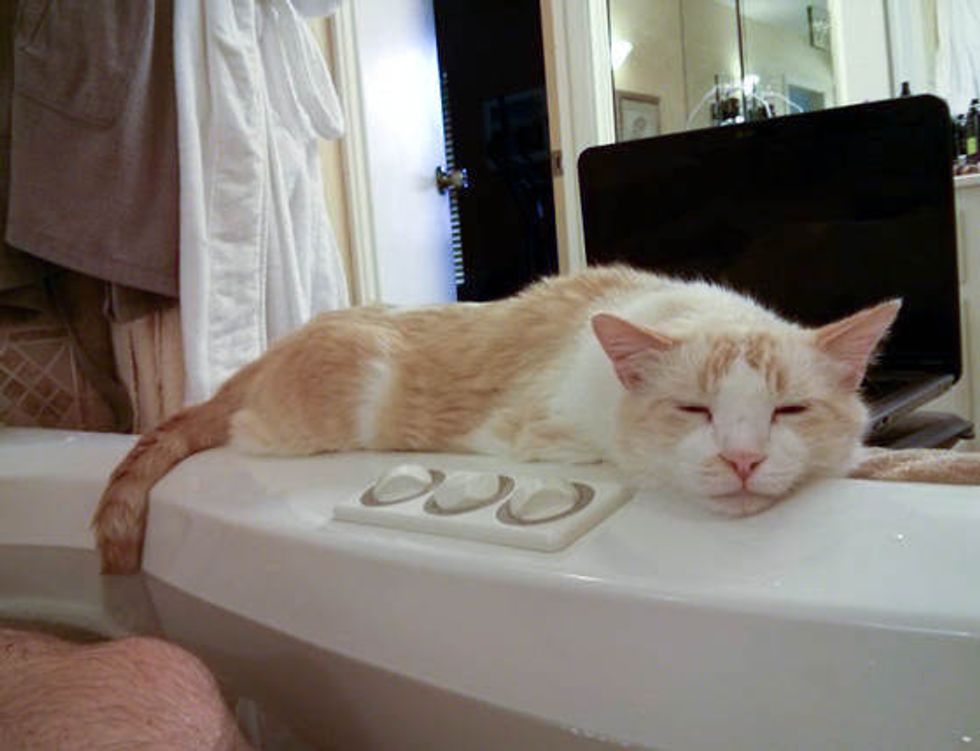 After a long workout session, the husband and wife decided to warm up in a jacuzzi tub to relax. That's when the cat "barged in and made himself comfortable in front of the laptop we were trying to watch a movie on."