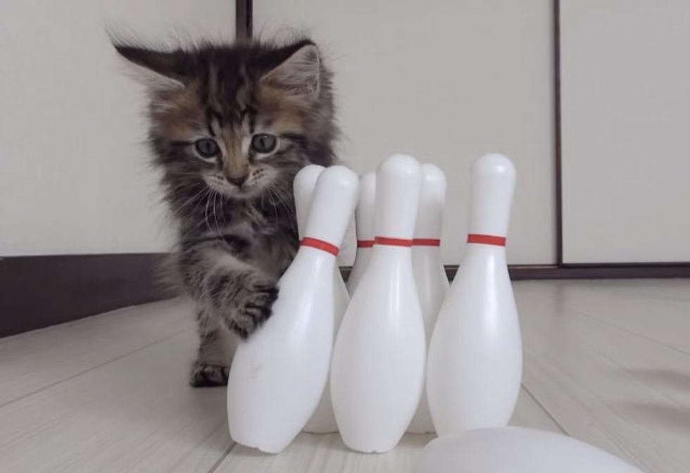 He turns himself into a fluffy bowling ball and knocks down the pins in a purrfect strike and then another purrfect strike!
