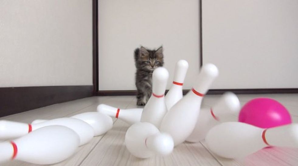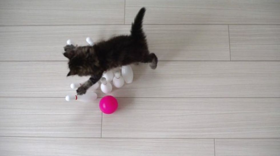 I have never seen a kitty enjoy bowling quite like this (see video below). Osamu the new addition to the family of 9 cats (now 10) is not allowing a single bowling pin to stand straight in the house.