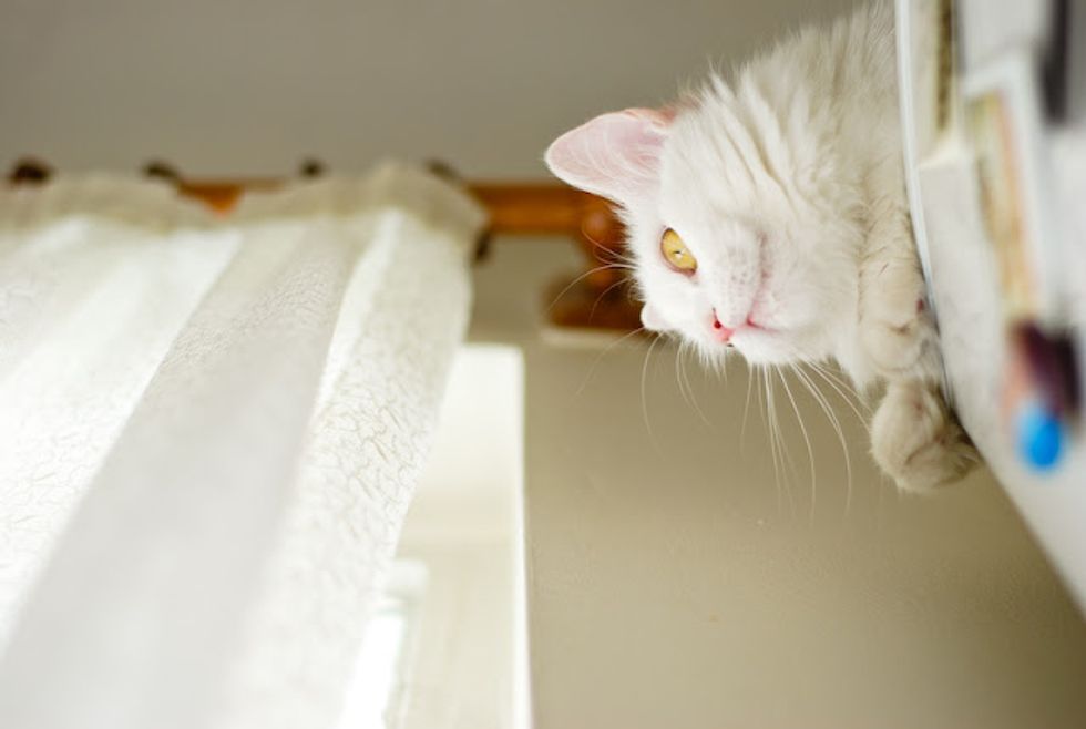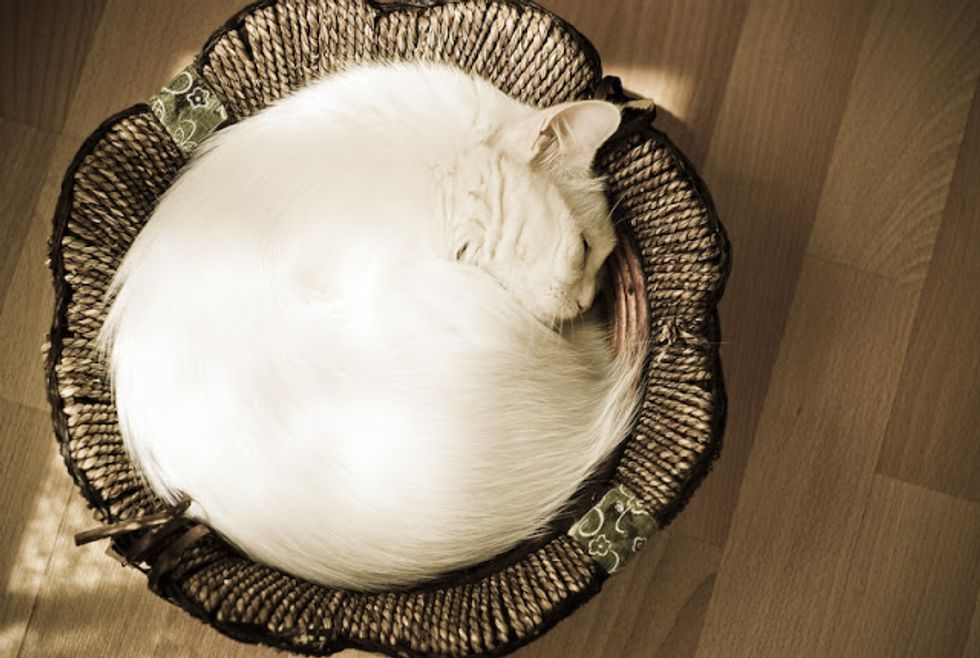 She always loved to sit on top of the refrigerator, watching pigeons and sparrows settling on windows and balcony. That was her favourite spot, it always felt great, knowing that she was there while me working in the kitchen. Also, we were always amazed by her being curled up asleep in her small round basket presenting an image of a delicate "flower cat".