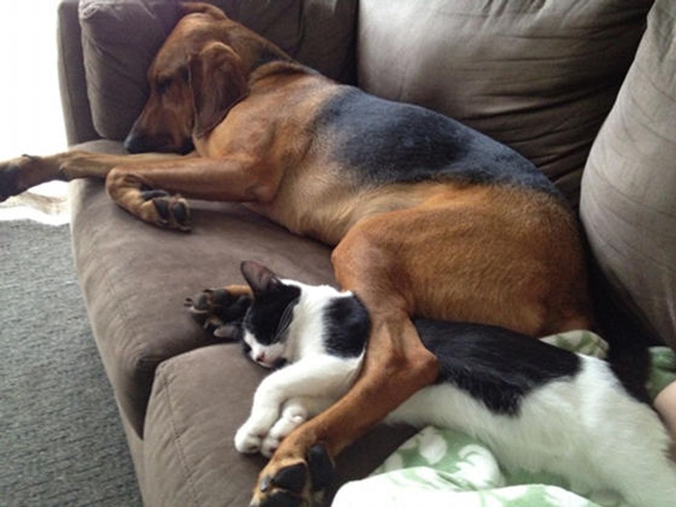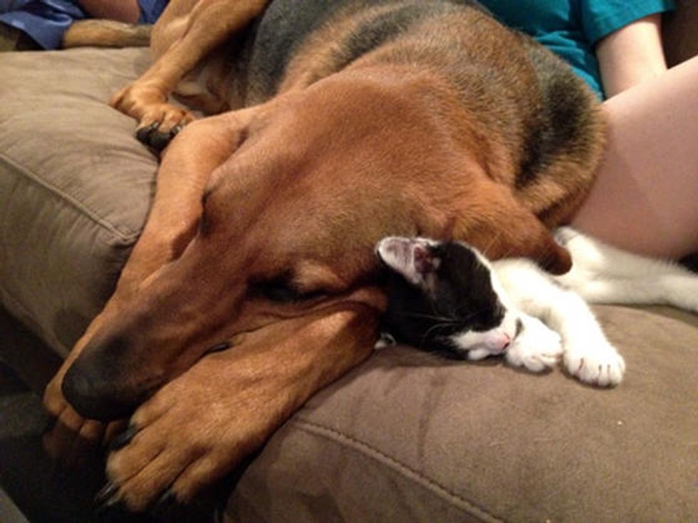When Potato the cat came to his new home, he was welcomed by a gentle bloodhound mix who took him in, and they have been best friends ever since.