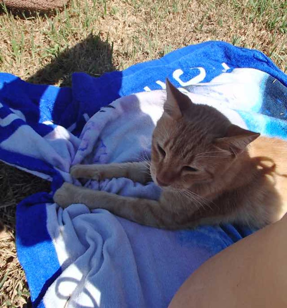 George wouldn't go anywhere when she was around. He stayed by her side and kneaded on her towels while purring away. Soon the two became inseparable. Charlotte made up her mind that she would take him with her so he could have a loving home that he always deserved.