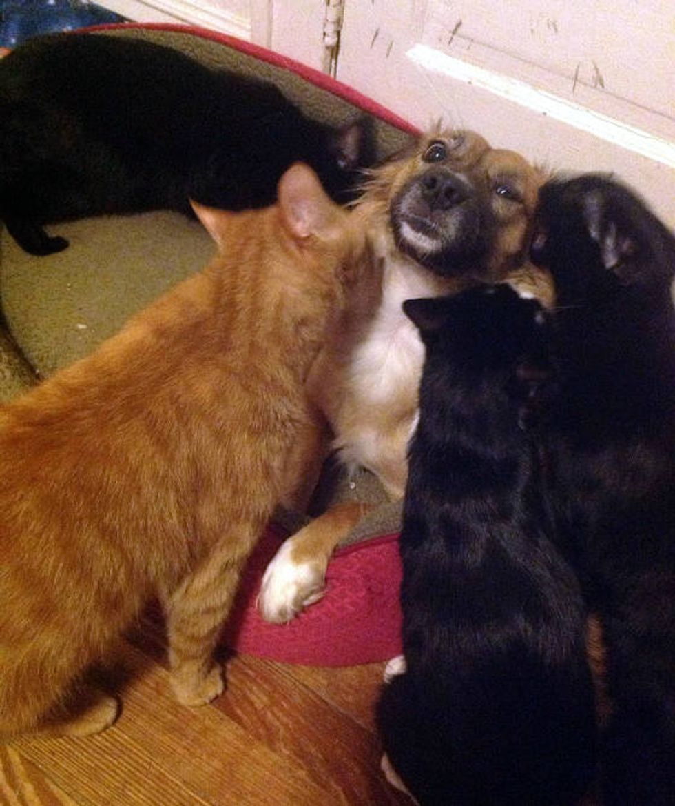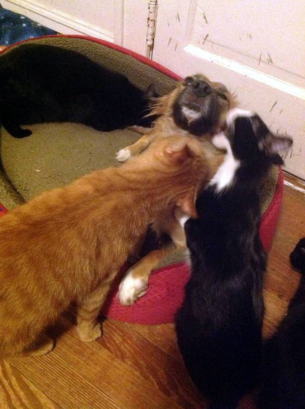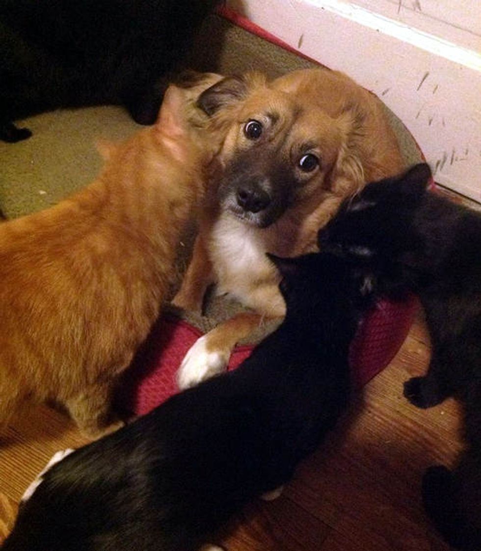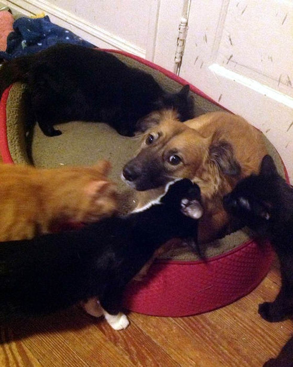 When the dog comes back from outside, all the kitties approach her and start investigating.