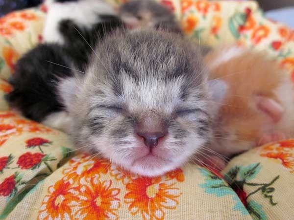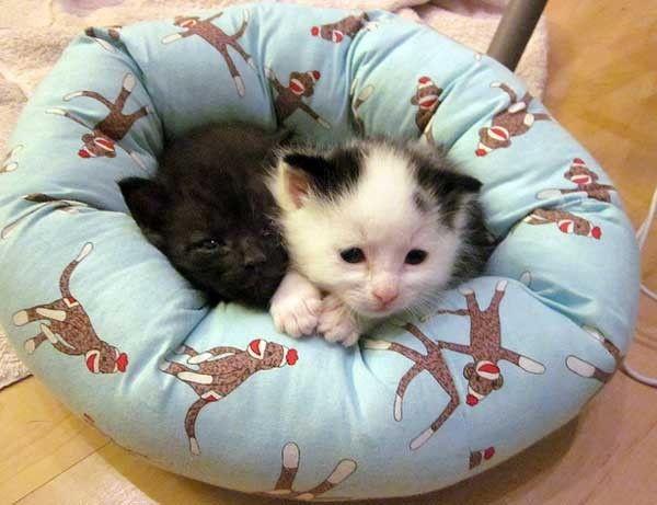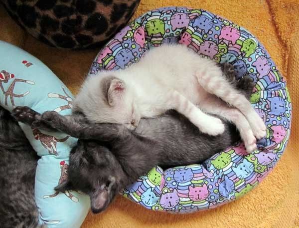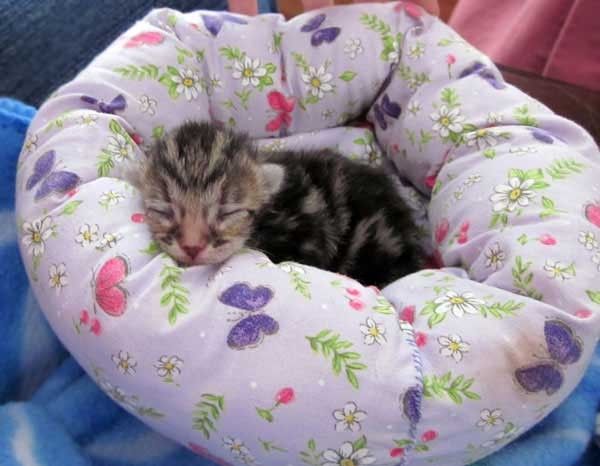 Tiny little beds make these tinier kittens very happy. These bitty fosters love how snug and comfy they feel. At that stage, no matter how many beds are lying around, they seem to always pile up snoozing together. It's so ridiculously cute :).