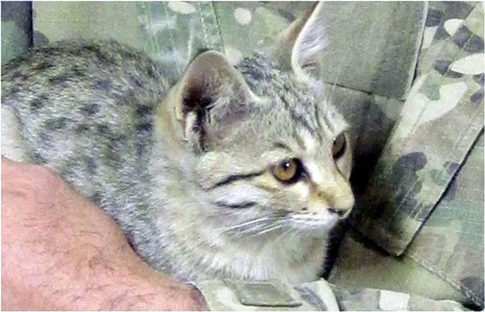 "We told our wives about the kitten we had rescued and they started sending real cat food for her to eat. We want her to find a home in the US because she is the sweetest little kitty. For being a feral cat from a harsh country, she loves to snuggle and play. She always keeps us company when we're up on guard and is quick to occupy a lap if she sees one open. She has been a definite morale boost as we spent our time in a remote area with very little in the way of amenities."