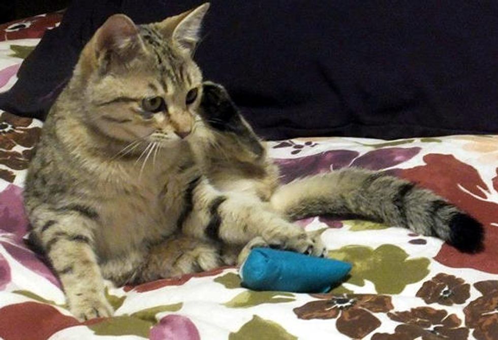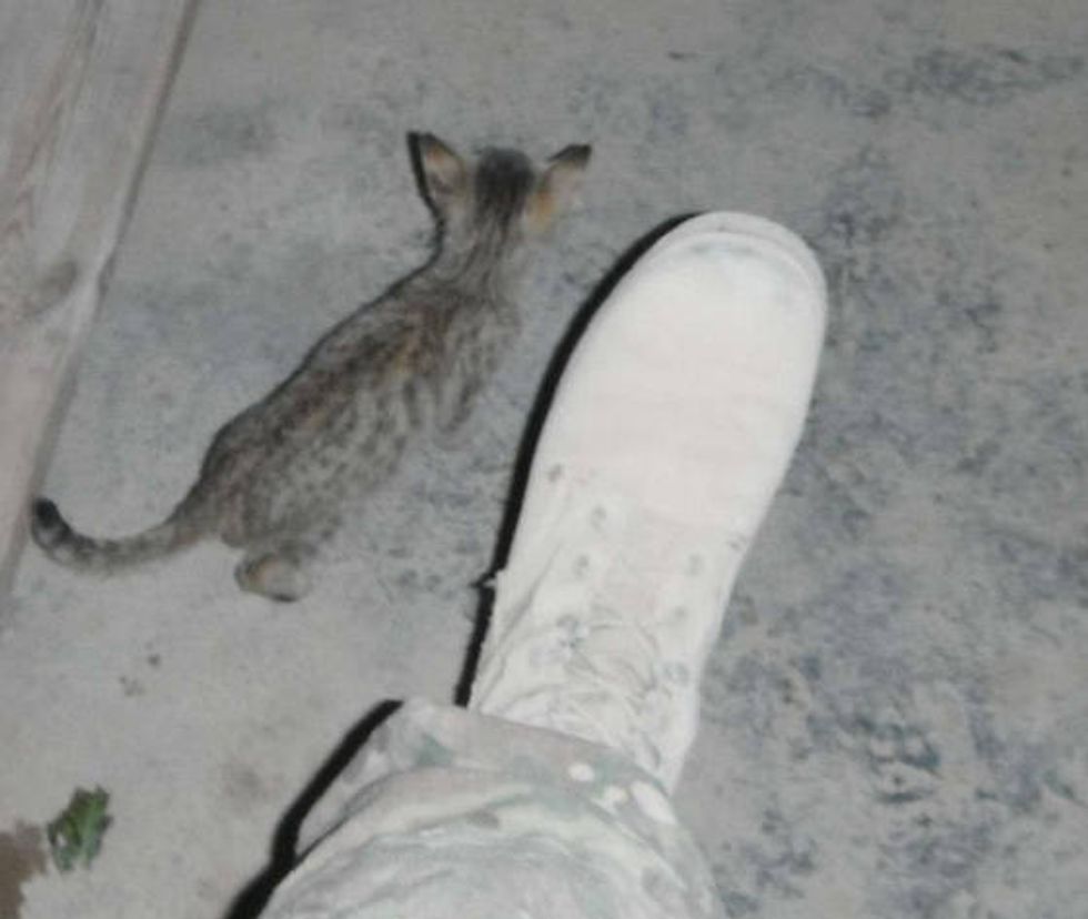 "We first met Bacon Cat when she crawled out from under our barracks building looking like she was starving and meowing up a storm. As you can tell from the photos, when we found her, she wasn't even as big as my foot. She's just a tiny little thing, and she quickly won the hearts of me and my fellow soldiers and we did the only thing humane individuals could do. We offered her food and water and play. We started calling her Bacon because when she first came to us, it was the only food we had to give her. Once we started getting other kinds of food for her to eat, we realized she had a favorite. She would devour any bacon thrown her way with a quickness. Thus the name," said the soldier to Nowzad.