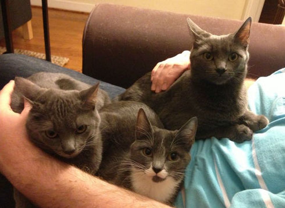 They named them: Eleanor Rigby, Professor Socks, and Squints. They are all girls. "They'll often cluster together for naps, or for climbing on me. As soon as I sit down, they begin the ascent," Dan added.