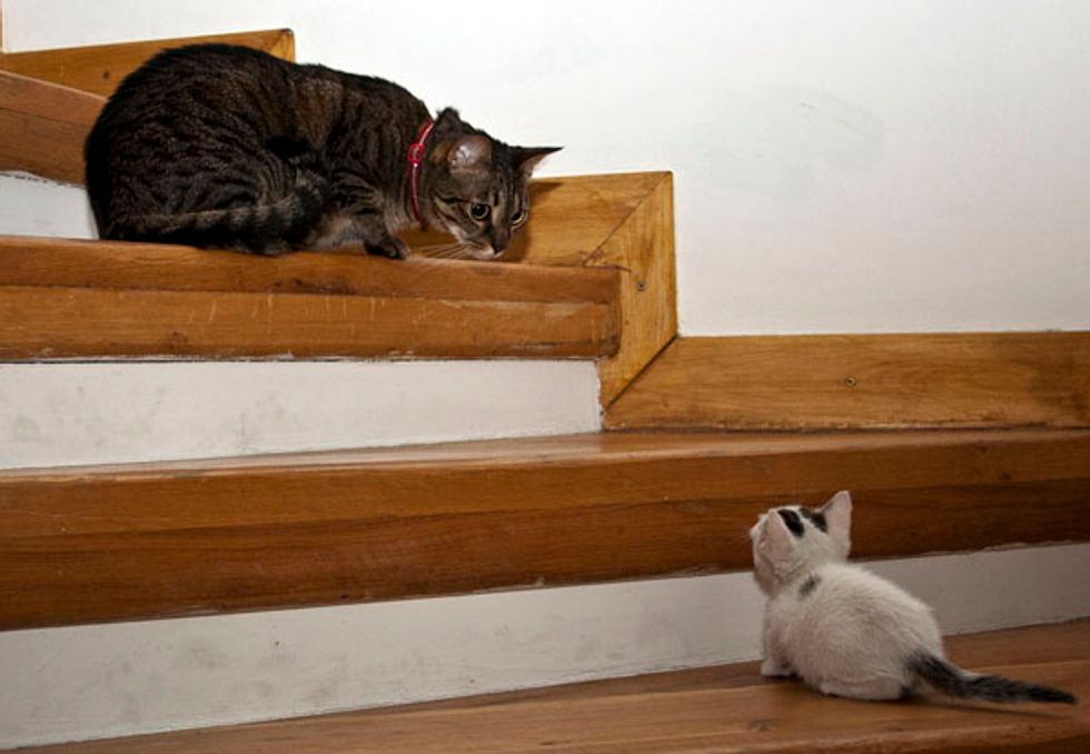 Chance one of the cat residents became very fascinated by the little new comer. They immediately became friends.