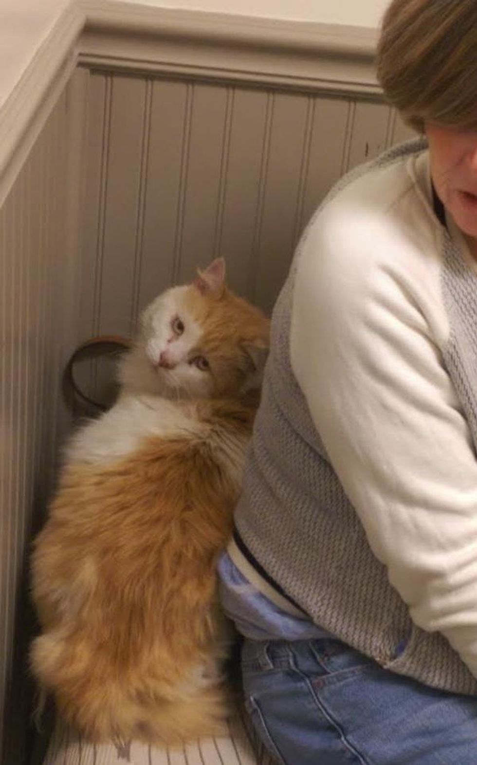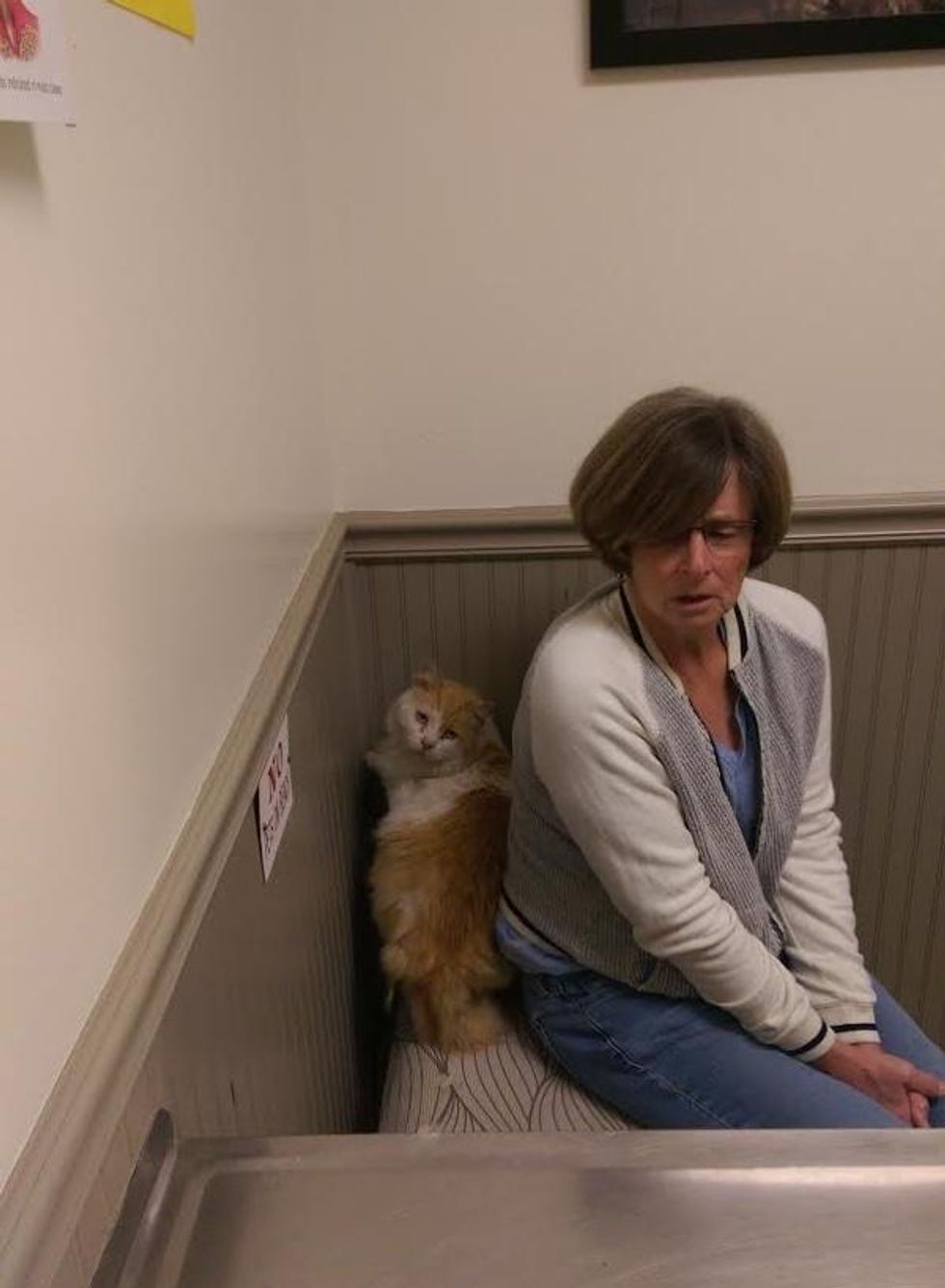 The sweet ginger boy huddled up to his human, now, human mom, at the vet and wouldn't go anywhere without her.