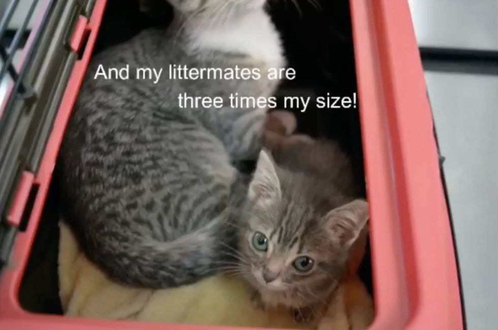 This little kitten is just 1/3 the size of her siblings. She has trouble eating and her belly is never full, but the tiny miracle baby is determined to get bigger and stronger every day despite her condition.