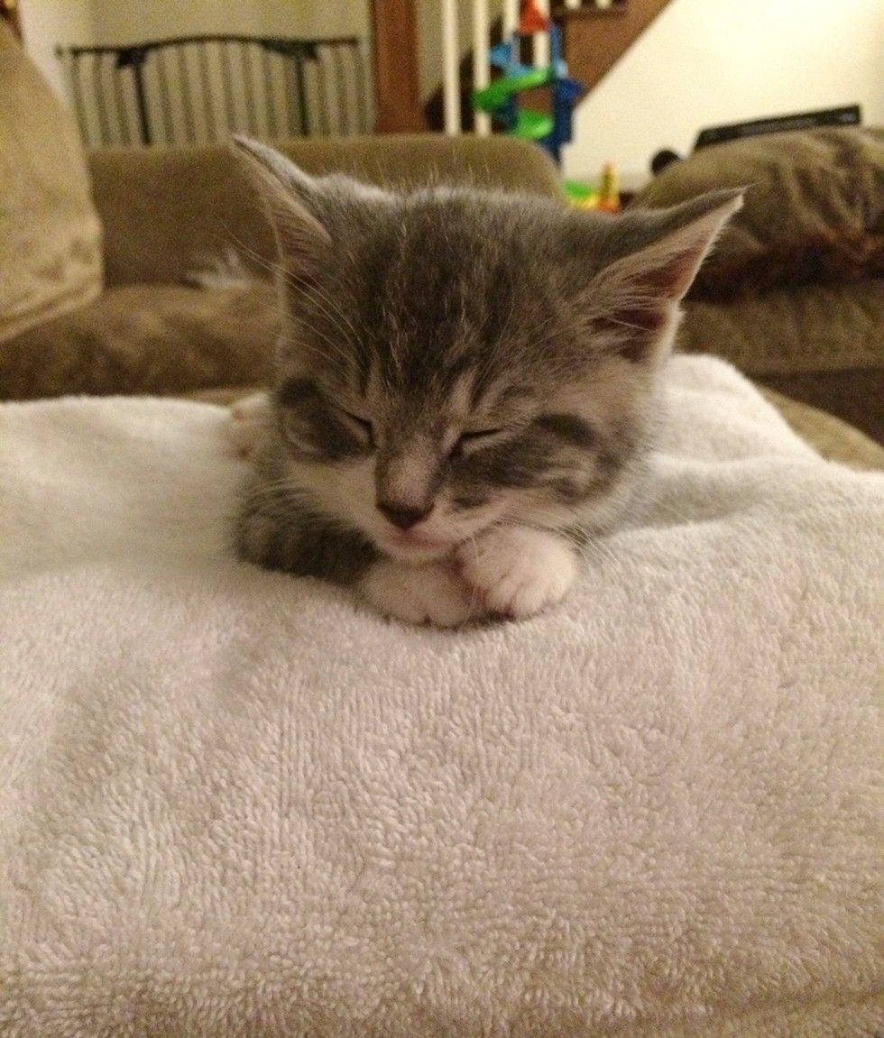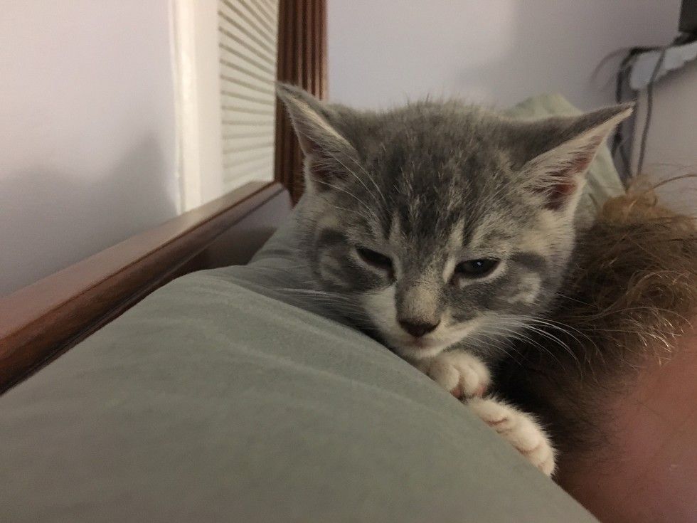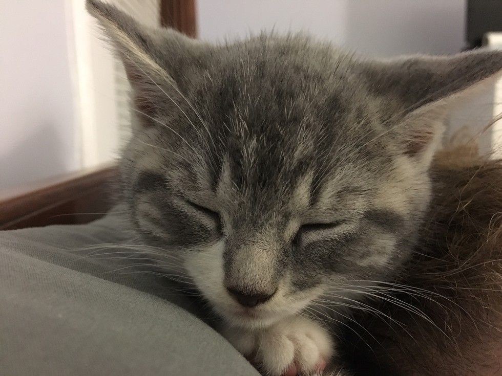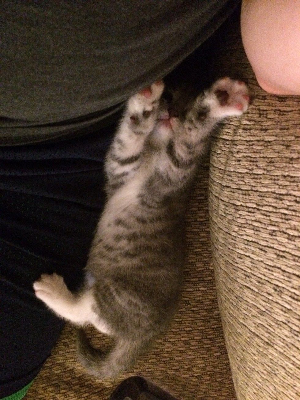 Little Auri has found her favorite place to nap - right next to her human dad at her new home.