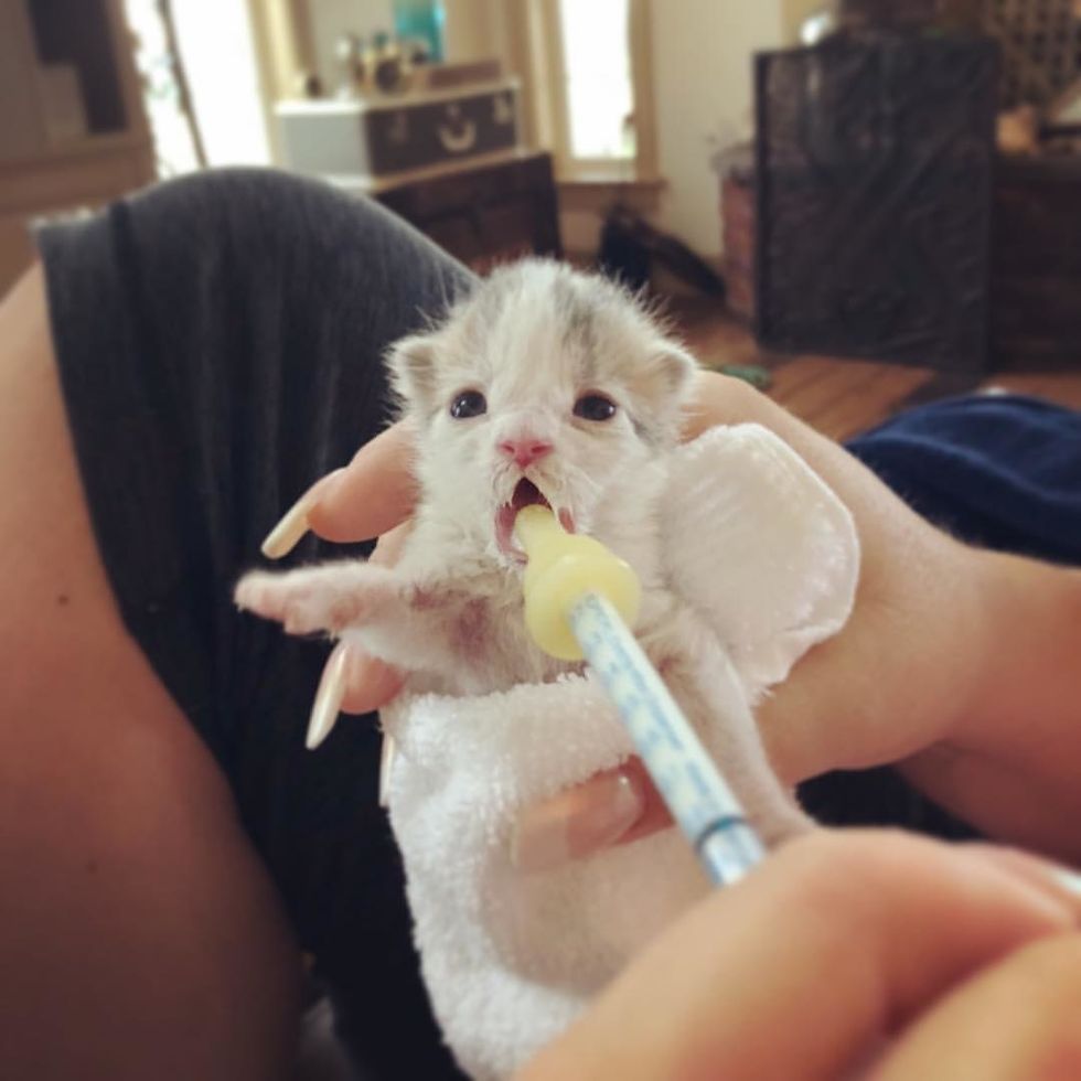 Annalise put her summer part-time job on hold so she could care for the kitten. "My older sister drove down six hours and used her vacation days to come help me. Those first two weeks, we both had 12 hour shifts, feeding, wiping, and putting her to sleep," she told Love Meow.
