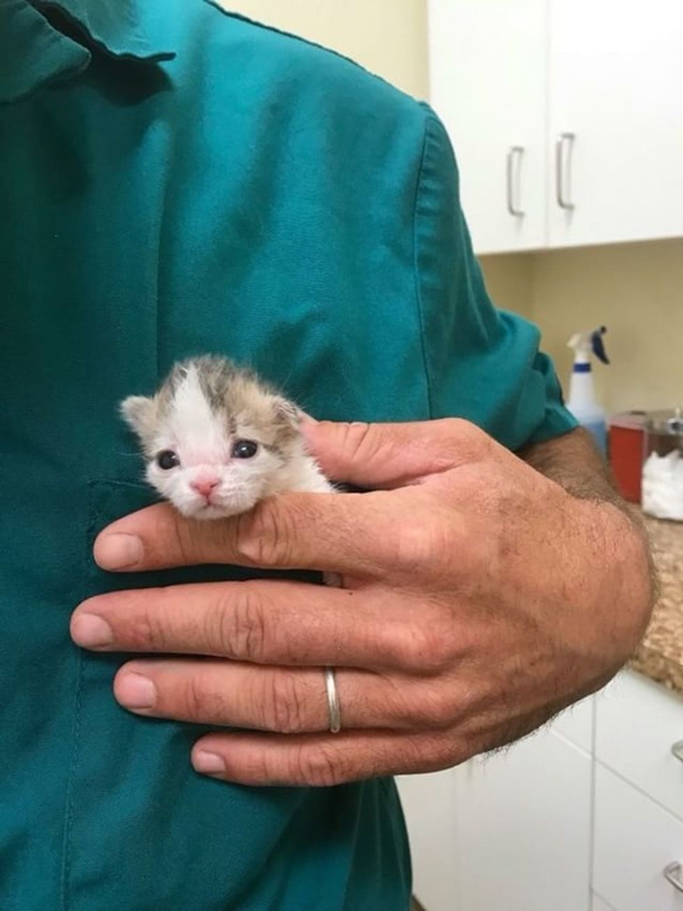 The shelter and the animal hospital were closed at the time, so they went to get fresh goat milk from a local goat farmer and started feeding the kitten through a syringe.