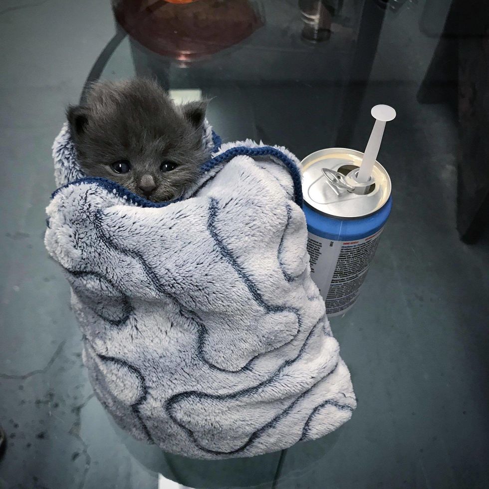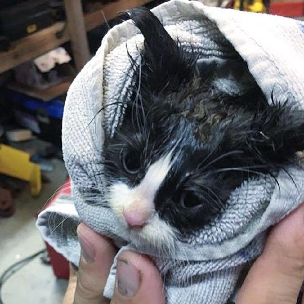 A little kitten was found abandoned on a country road. She was drenched in water, cold and just skin and bones.