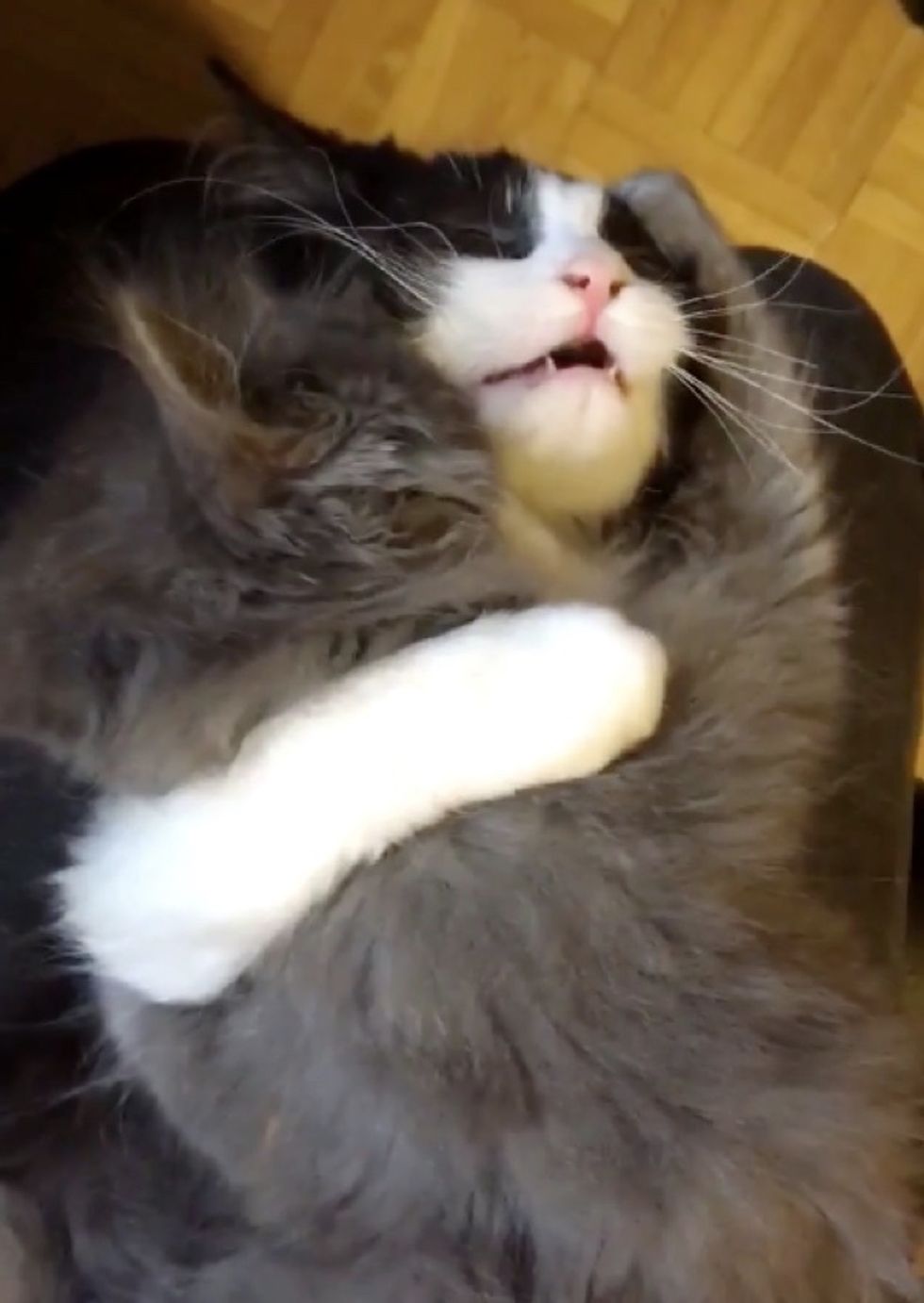 The grey kitty couldn't stand being alone and would meow incessantly until she was picked up and held.