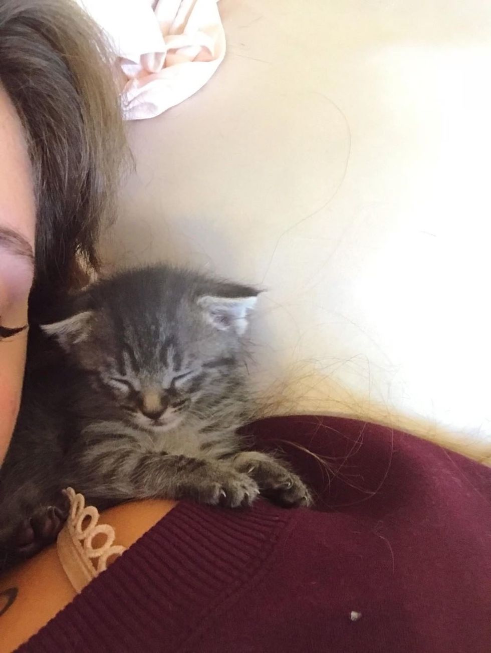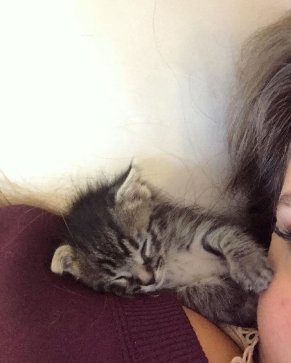 "She cries for me to pick her up all the time so she can sleep on me," Avery told Love Meow. "My shoulder is her favorite spot to nap."