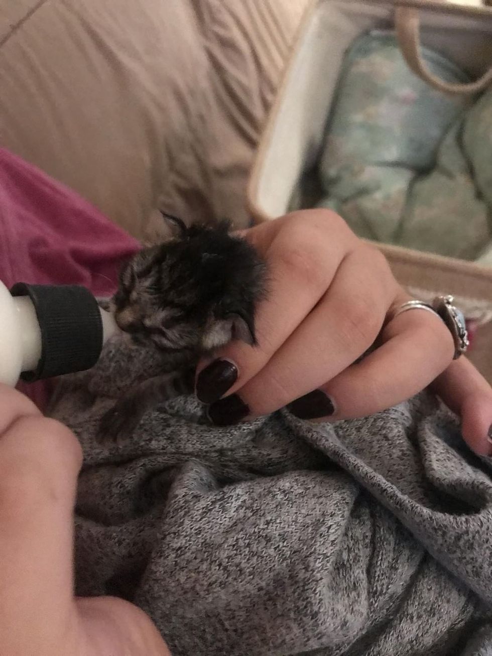The kitten whom they named Bindi, was about one day old at the time. "The first thing I did when I brought her home was prepare her formula as fast as I could. She wouldn't latch at first but after I switched to a smaller bottle nipple, she did."