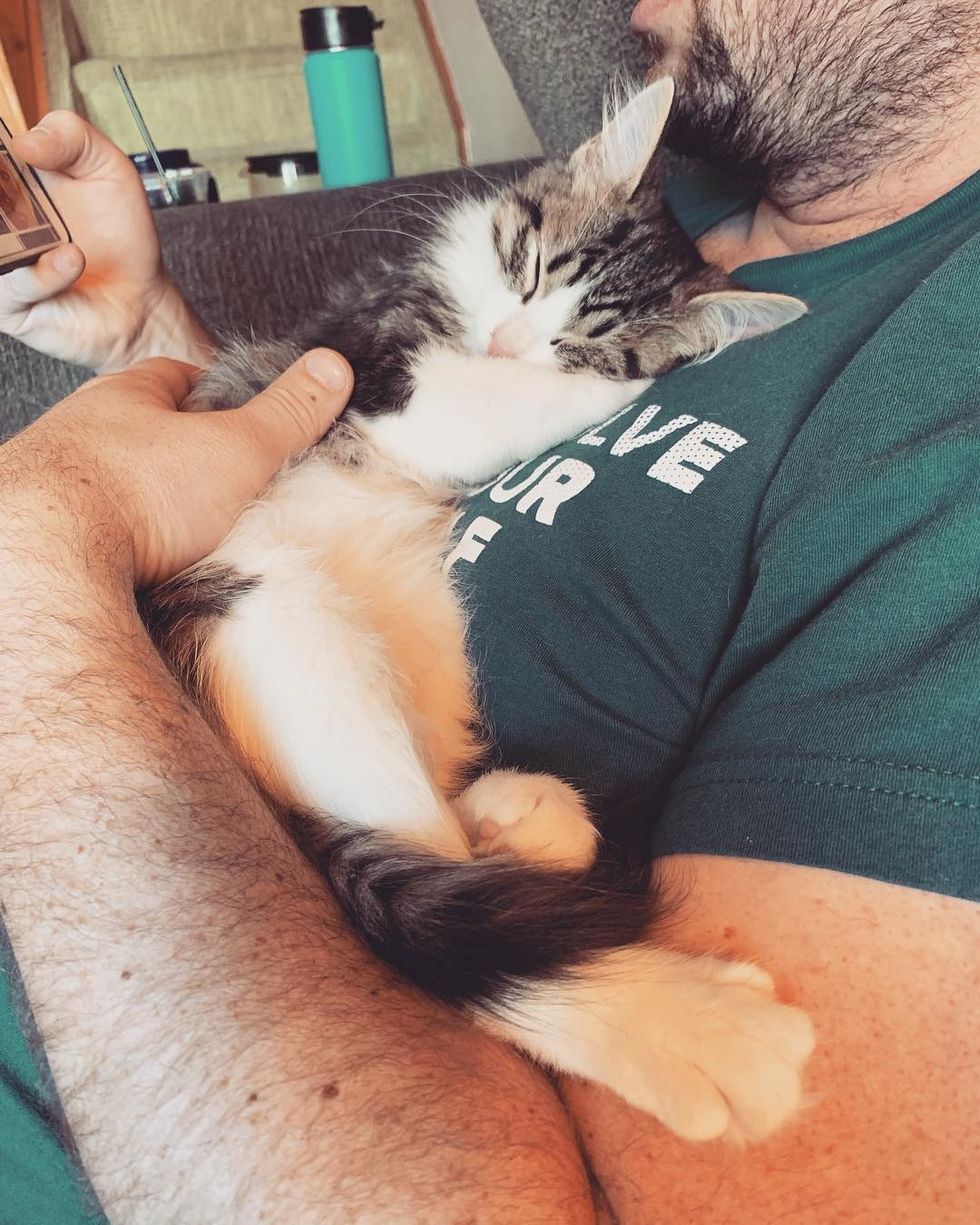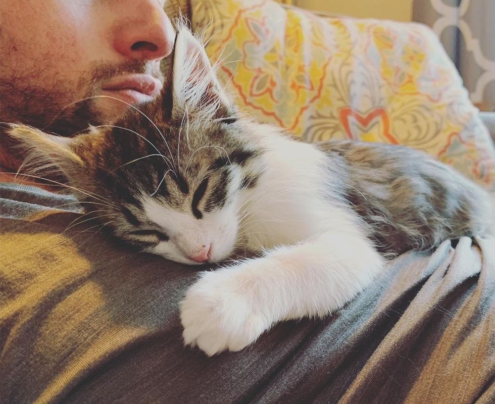 "This kitten loves to knead wherever he can. I wake up at least once a night to little Pete kneading my face or neck. Luckily, he's pretty gentle about it and the claws don't come out in full force."