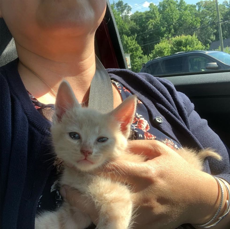 An Miller from Virginia adopted a kitten who needed a home. His name is Ham Biscuit aka Hammy, and he was very needy from day one. On his way home, he meowed nonstop in the car until his human mom picked him up and cuddled him in her arms.