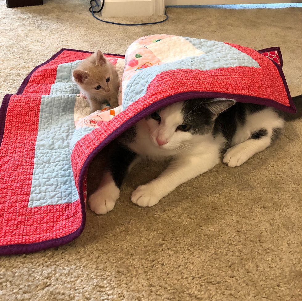 When Shortcake tried to hide under a blanket from the kitten, Hammy patiently waited for her to pop right up. When she was relaxing on the couch, the little one wrapped his arms around her, trying to win her over.