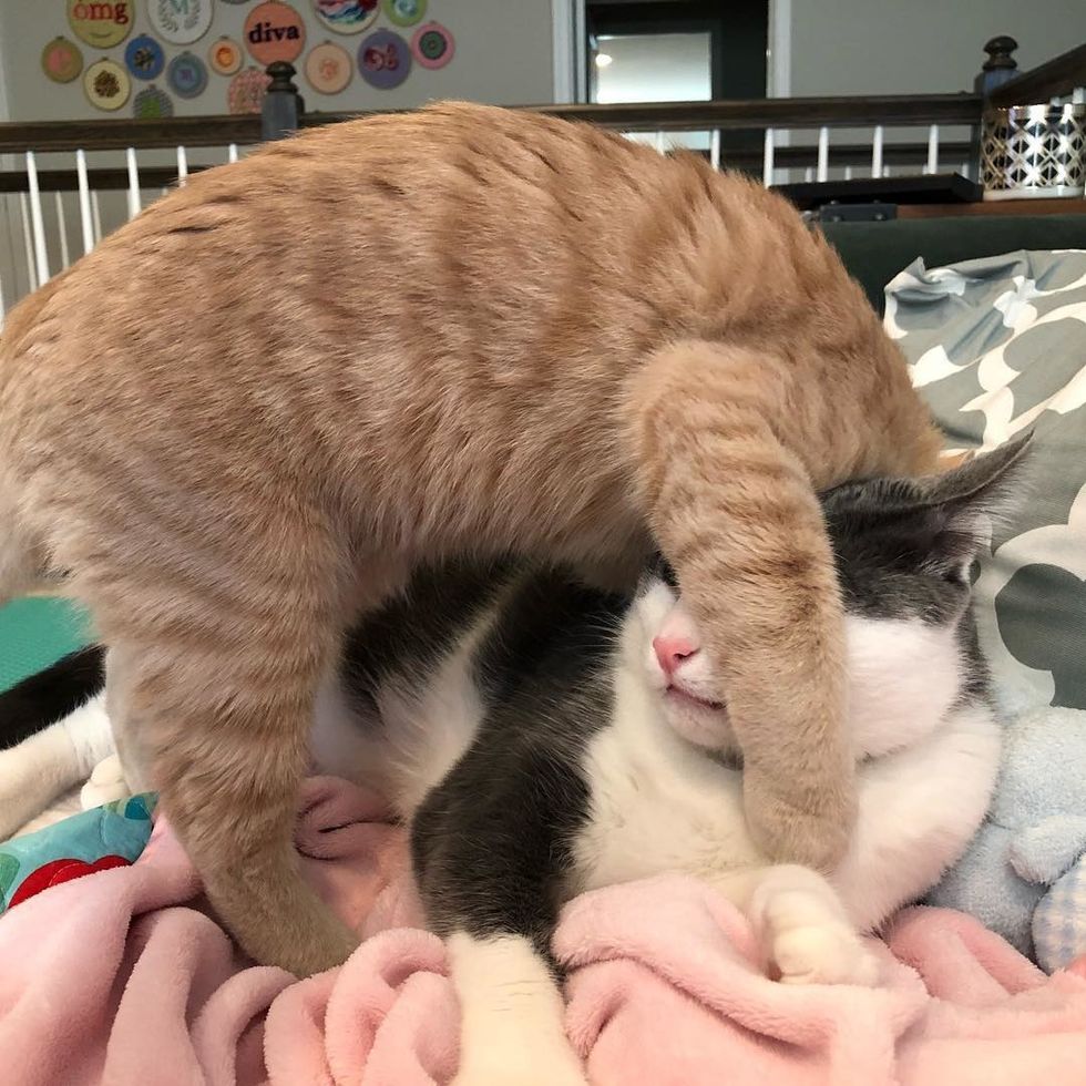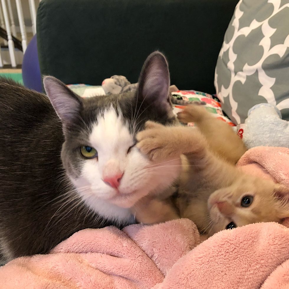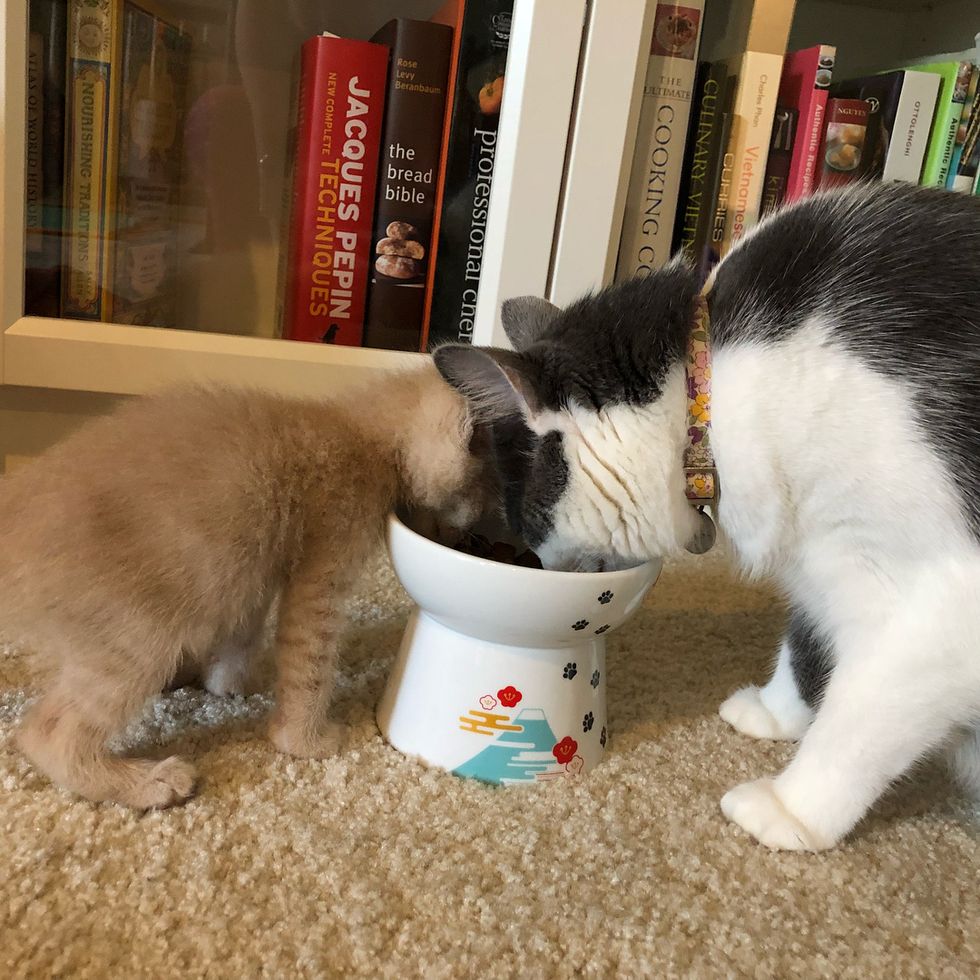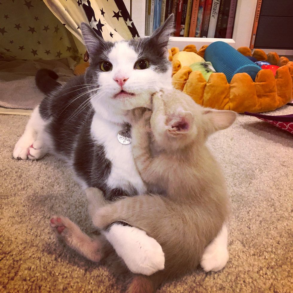 She showed him the ropes and taught him how to play and eat like a big kitty.