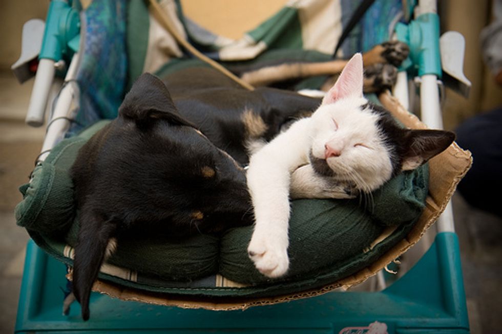 The kitty in the video loves her doggie friend. She is holding the puppy as if she is saying "my precious!" Click play to watch the video: