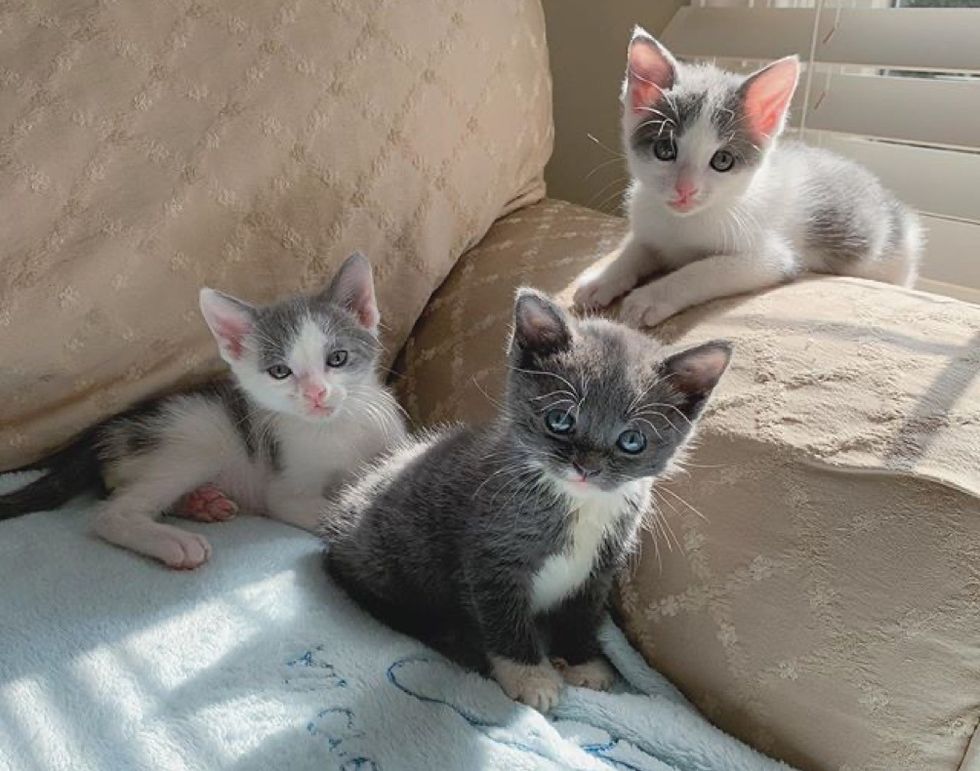 A lone kitten was so happy when she met two feline siblings. She cuddled right up to them.