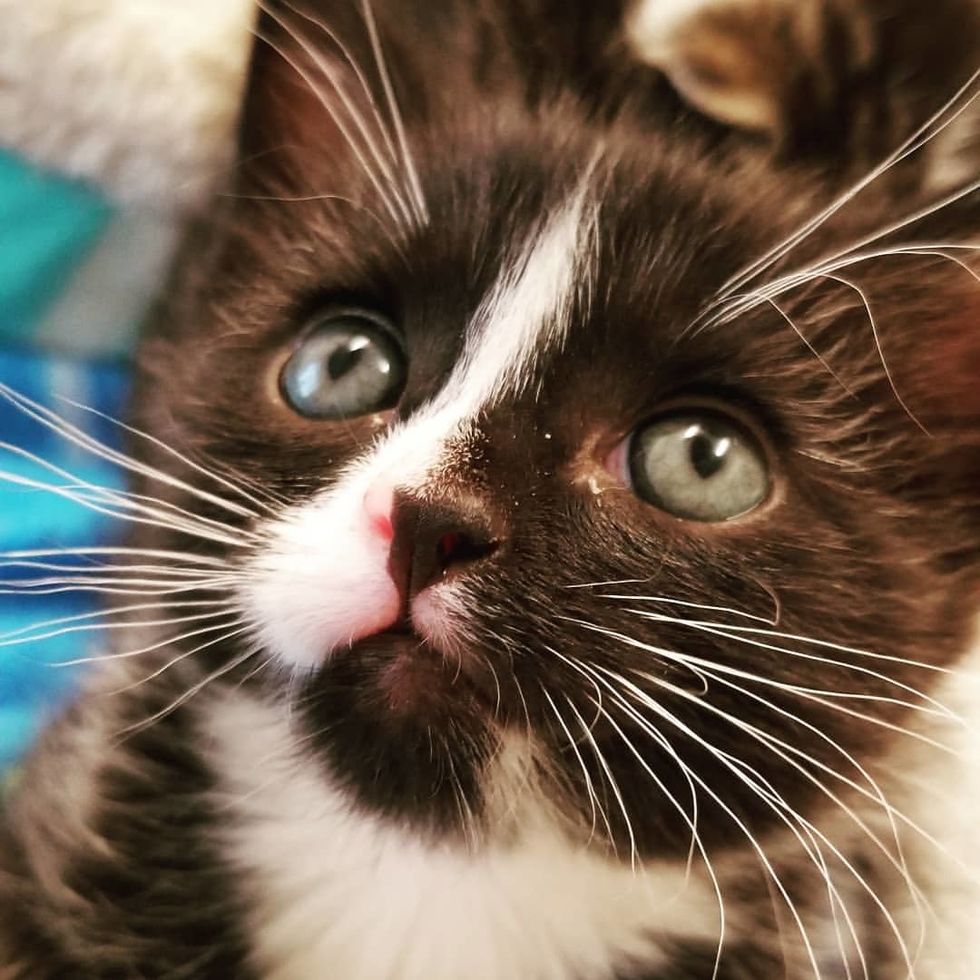 The little orphaned kitten who was found crying alone in the yard, has blossomed into a gorgeous tuxedo kitty with a big purrsonality.