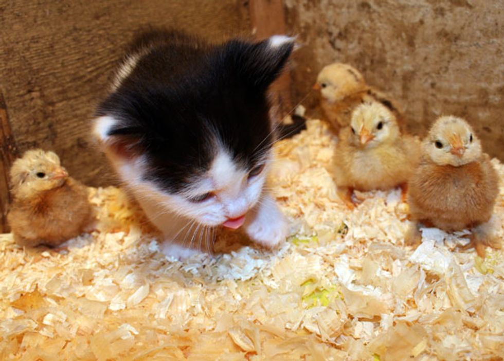 The teeny kitty not only enjoyed hanging out with the little chicks, he also helped them clean up and gave them bathes.