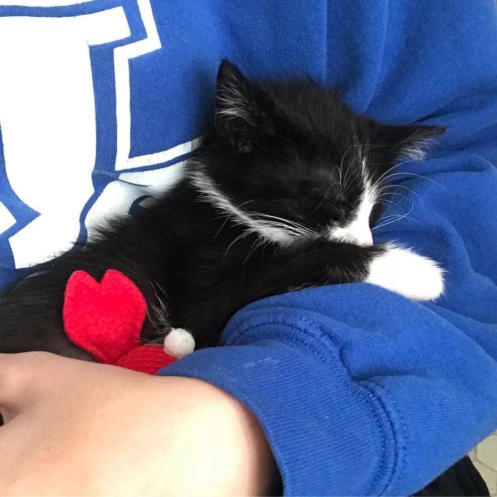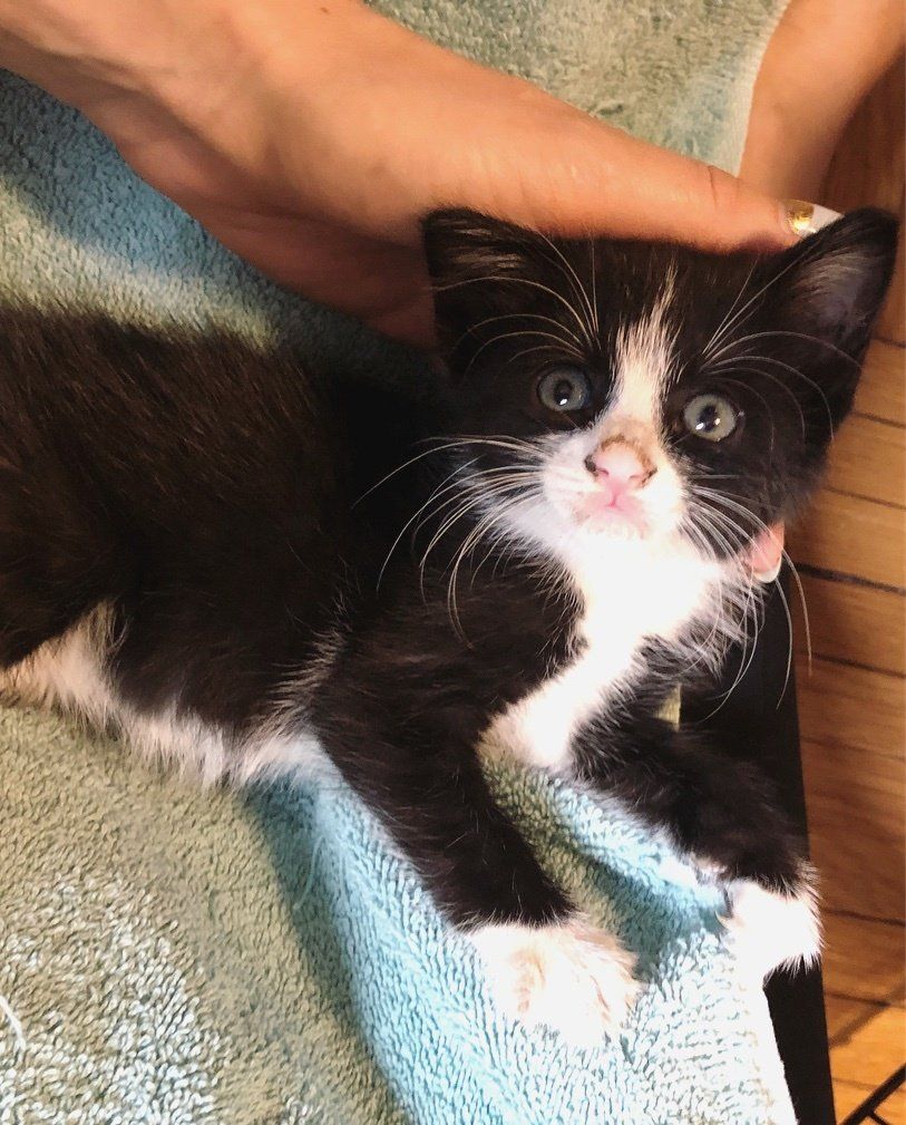 Amelia volunteered to foster the kitten so the little tuxedo would have a comfortable place to start her new VIP life. They named the kitten Pepper. "She is safe, clean, comfy, and flea-free. She'll never be alone or hungry again, and the rest of her days will be filled with love."