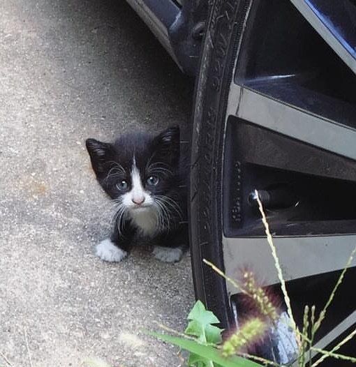 A tuxedo kitten wandered into a backyard but quickly ran away. When she came back, she walked right up to the family for help.