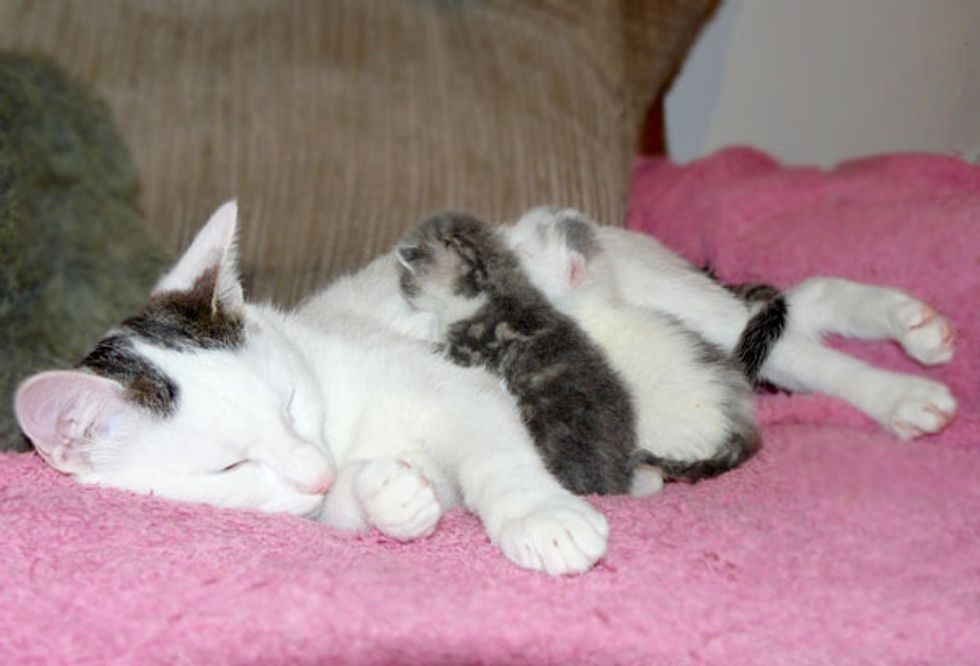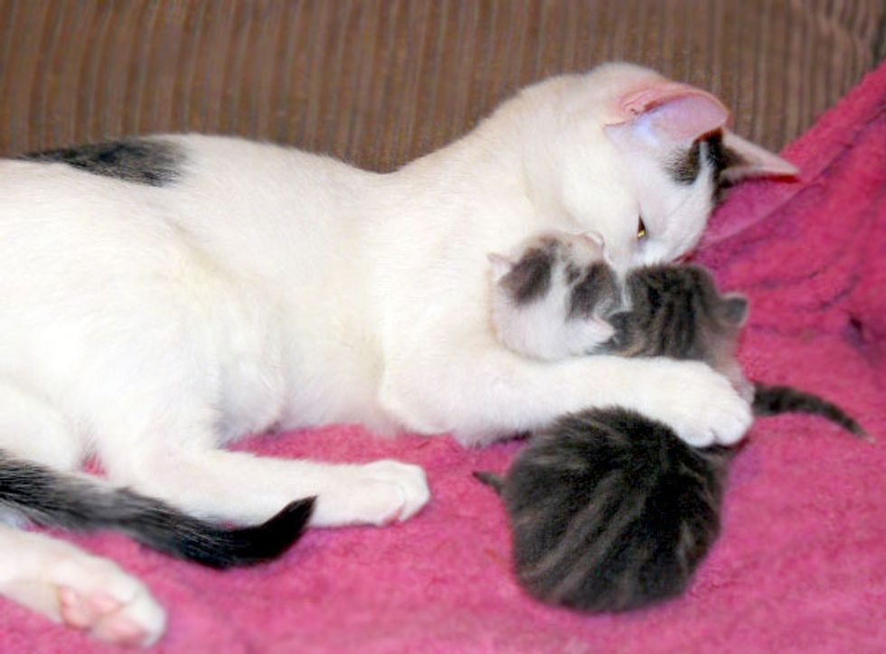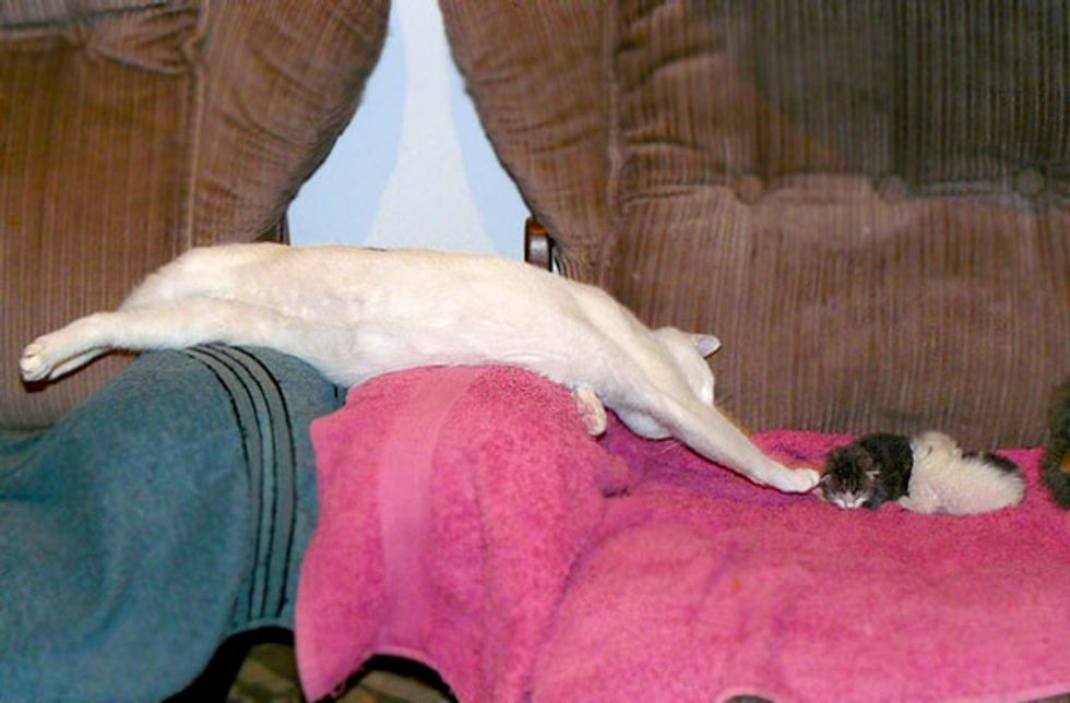 Noël nurses them and grooms them like a nurturing surrogate dad, even though he is only a boy kitten. He likes to stay close by their side, watching them and being there for their every whim. The little kittens love him and think he is their dad. It's amazing how much love they have for each other.