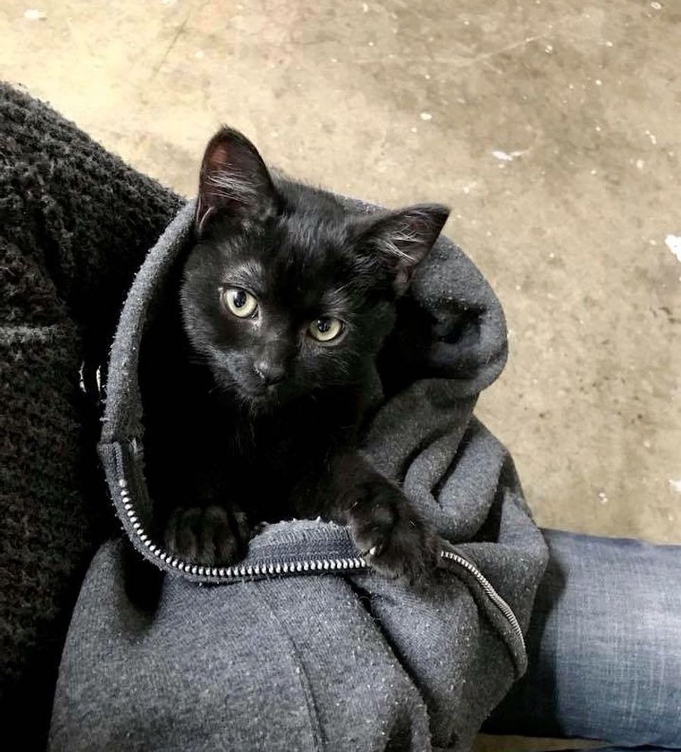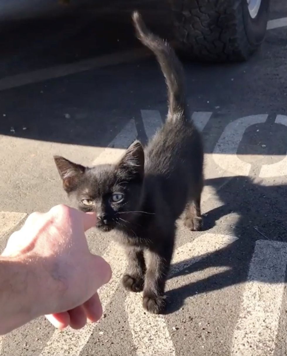Justin LaRose from Long Beach, California was on a break from work when he heard a kitten's cries. He followed the sound and spotted a little black kitten scrounging for food near a dumpster.