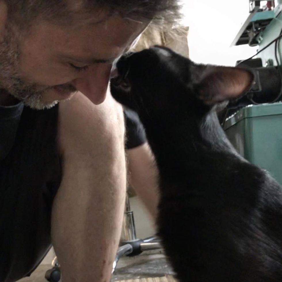 When Justin is working on a project, the little feline partner hops on his shoulder and offers some "help."