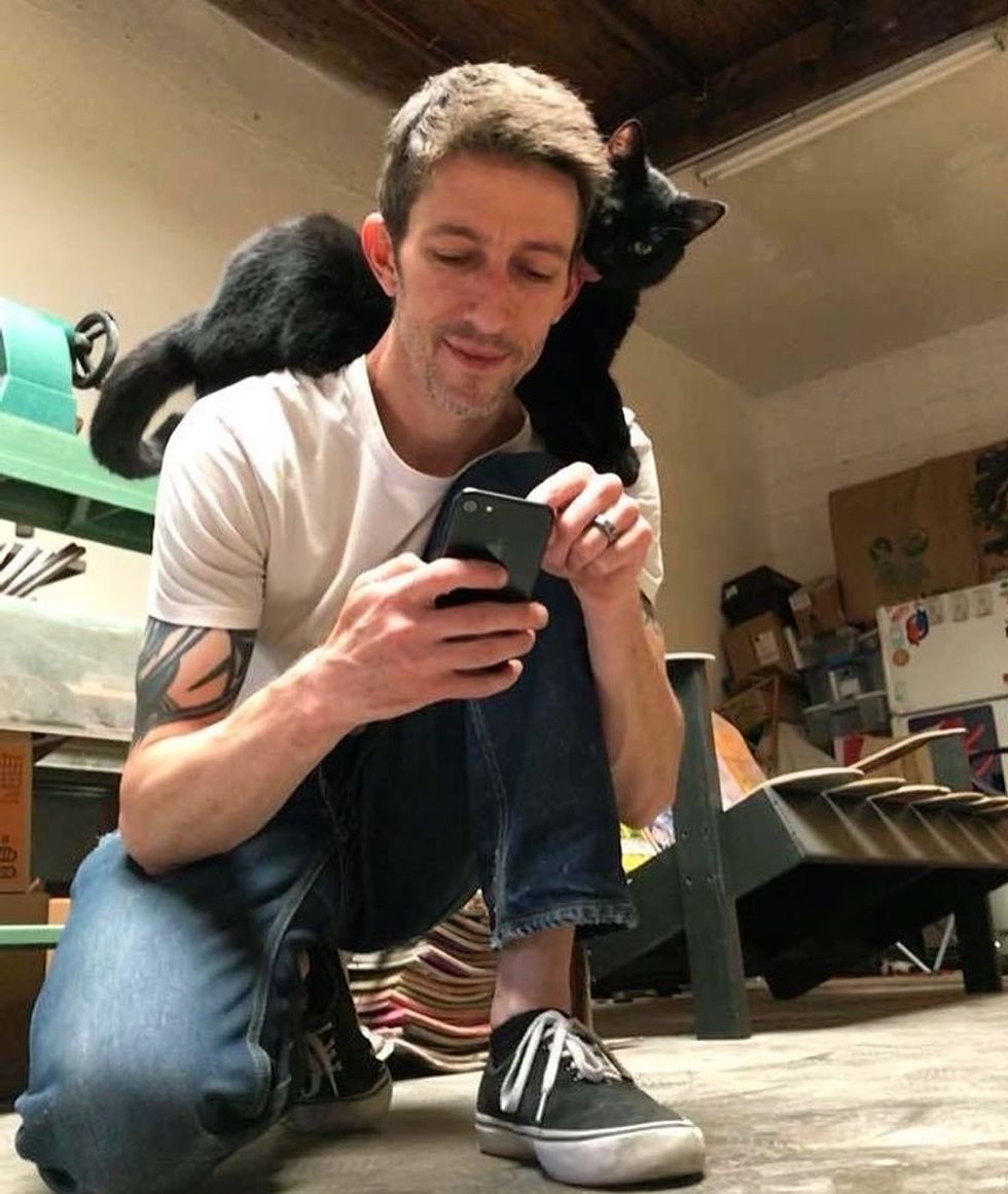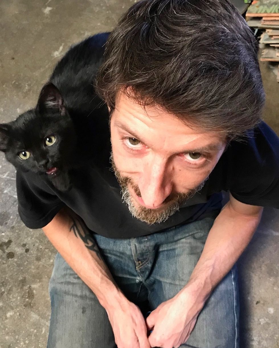 The kitty, named Grizzly, took it upon himself to be Justin's new work partner at his woodshop.
