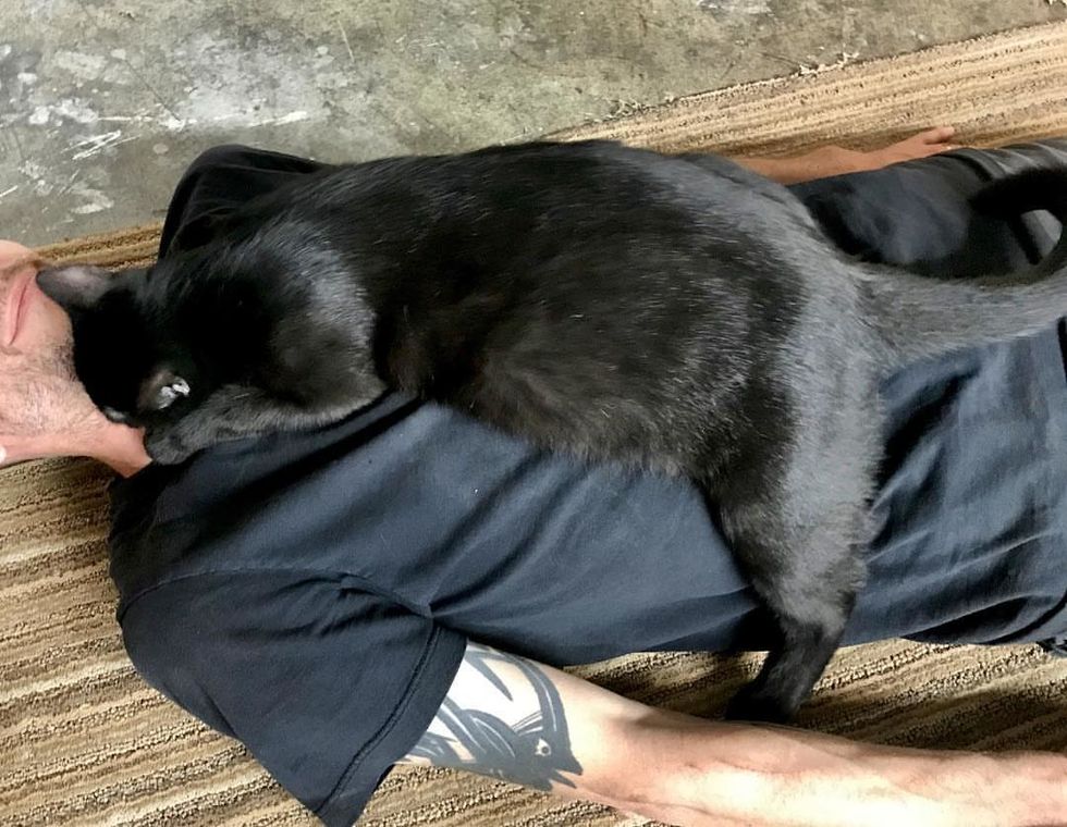 After sniffing his hand, the kitty switched on his purr motor and crawled into his lap for some much-needed cuddles.
